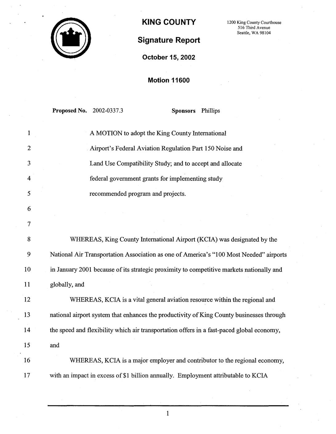 King County Motion 11600 – FAA Part 150 Noise and Land Use Compatibility Study