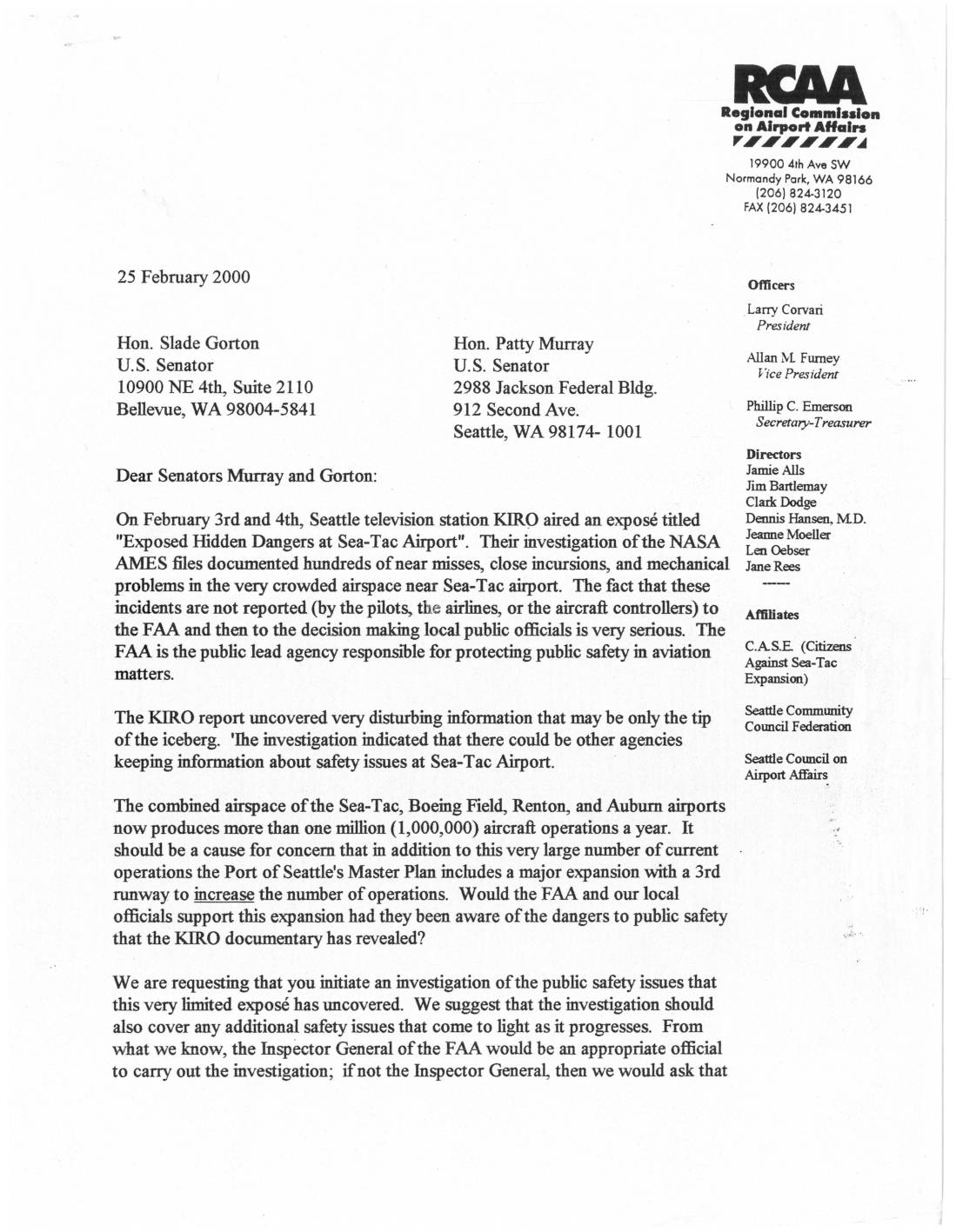On February 3rd and 4th, Seattle television station KIRO aired an expose titled "Exposed Hidden Dangers at Sea-Tac Airport". Their investigation ofthe NASA AMES files documented hundreds of near misses, close incursions, and mechanical problems in the very crowded airspace near Sea-Tac airport. The fact that these incidents are not reported (by the pilots, the airlines, or the aircraft controllers) to the FAA and then to the decision making local public officials is very serious. The FAA is the public lead ~gency responsible for protecting public safety in aviation matters. The KIRO report uncovered very disturbing information that may be only the tip of the iceberg. 'Ihe investigation indicated that there could be other agencies keeping information about safety issues at Sea-Tac Airport. The combined airspace of the Sea-Tac, Boeing Field, Renton, and Auburn airports now produces more than one million (1,000,000) aircraft operations a year. It should be a cause for concern that in addition to this very large number of current operations the Port of Seattle's Master Plan includes a major expansion with a 3rd runway to increase the number of operations. Would the FAA and our local officials support this expansion had they been aware of the dangers to public safety that the KIRO documentary has revealed? We are requesting that you initiate an investigation of the public safety issues that this very limited expose has uncovered. We suggest that the investigation should also cover any additional safety issues that come to light as it progresses. From…