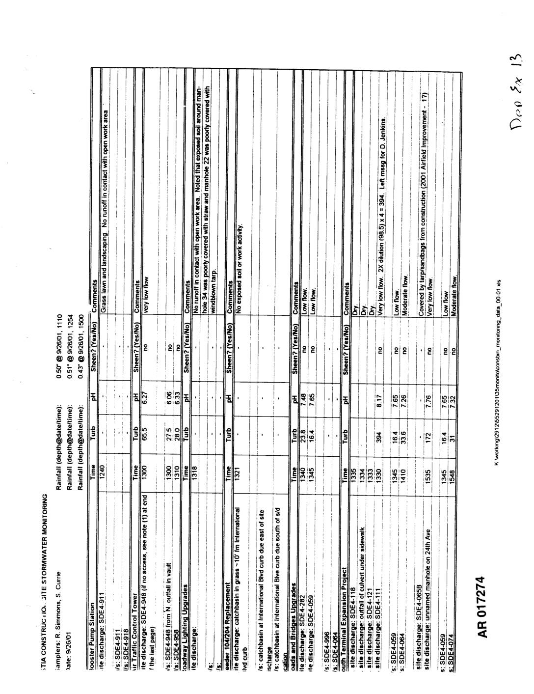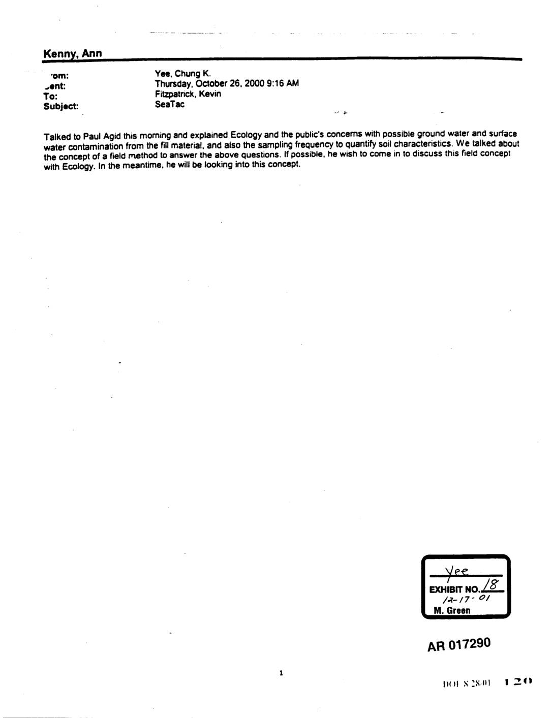 ,,ent: Thursday, October 26, 2000 9:16 AM To: Fitzpatnck.Kevin Subject: SeaTac Talked to Paul Agid this morningand explained Ecology and the public'sconcerns with possible ground water and surface water contamination from the fillmaterial, and also the sampling frequency to quantify soil characteristics. We talked about the concept of a field n-mthodto answer the above questions. If possible, he wish to come in to discuss this field concept with Ecology. In the meantime, he will be looking into this concept. AR 017290 ! I)()1 ,N",_,gll II 2() EXH0018017290 -