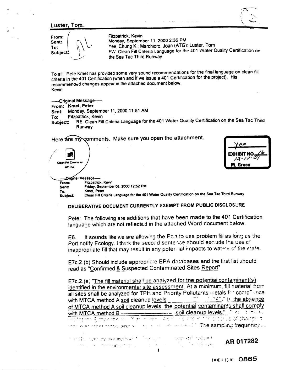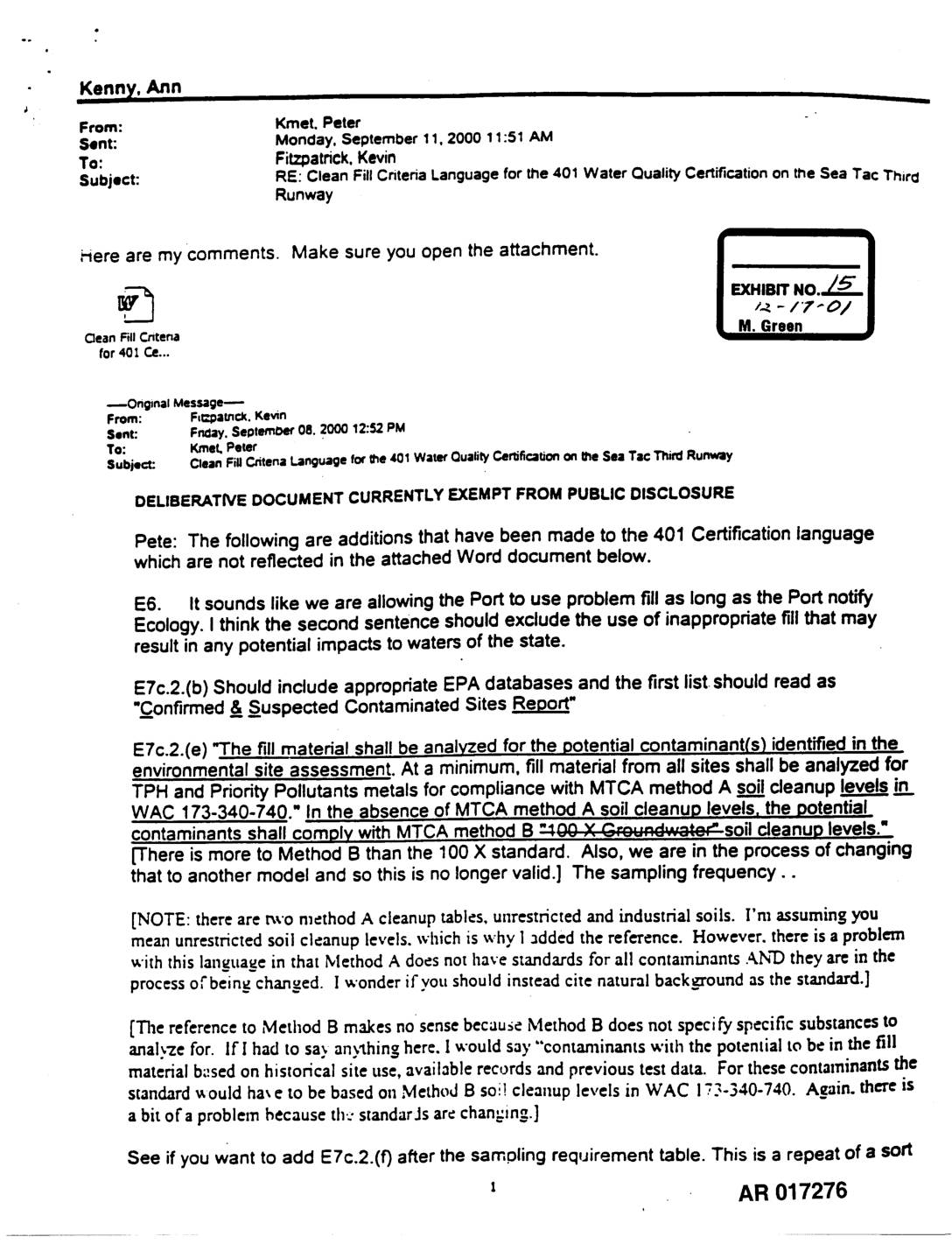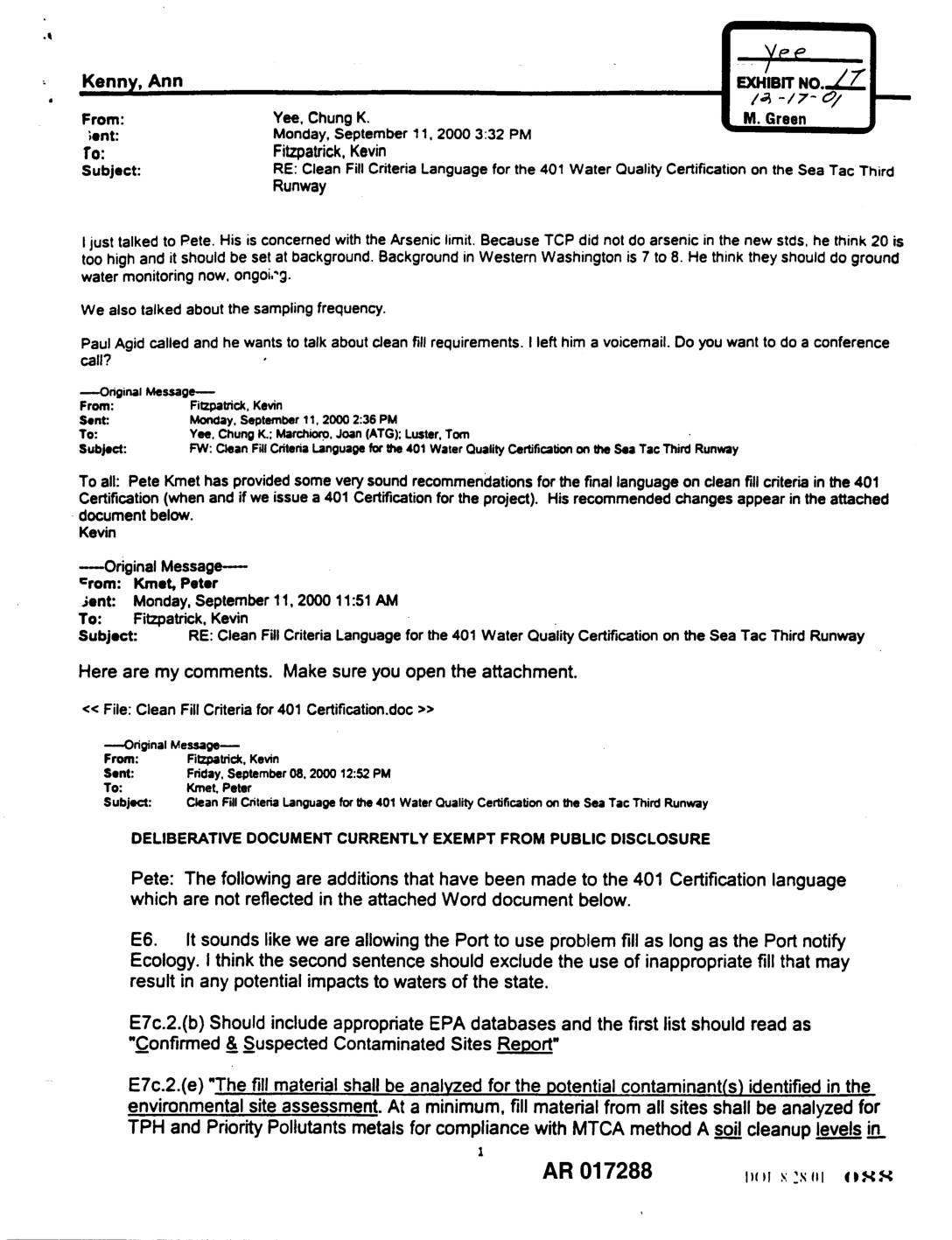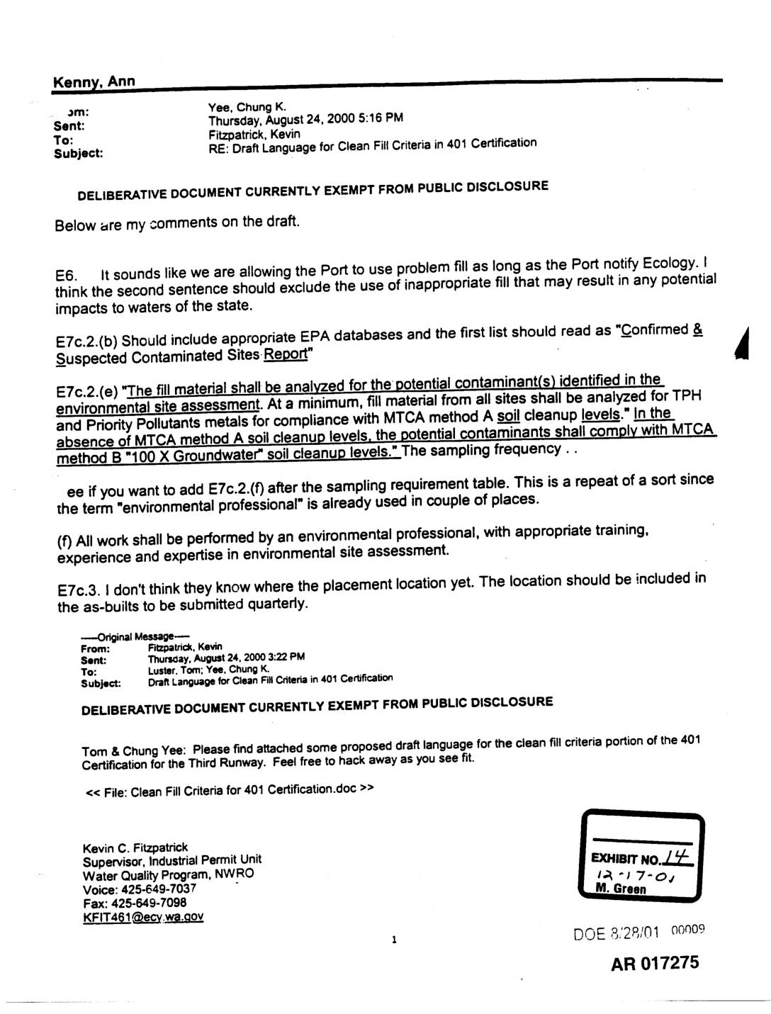 Sent: Monday, September 11. 2000 2:36 PM To: ' Yee. ChungK.;Marchioro,Joan(ATG): Luster, Tom Subject". j . FW Clean Fill Criteria Language for the 401 Water Quality Certification on _ .... the SeaTac ThirdRunway To all: Pete Kmethas providedsomevery soundrecommendationsfor the finallanguageon cleanfill criteriain the 401 Certification(whenand if we issuea 401 Certificationfor theproject). His recommeno=dchangesappearintheattacheddocumentbelow. Kevin mOriginal Message-- From: Kmet, Peter Sent: Monday,September11,2000 11:51AM To: Fitzpatrick,Kevin Subject: RE: Clean FillCriteriaLanguageforthe401 Water QualityCertificationon the Sea Tac Third Runway ere _¢_mment s. Make sure you open the attachment. CleanFU¢nulml1_ / " "___.._l;)_al Message--- From: Fitzpatrick,Kcwi_ Sent: Friday,September08, 2000 12:52 PM To: Kmet.Peter Subject: Clean Fill CriteriaLanguageforthe 401 Water QualityCertificationon the Sea Tic Third Runway DELIBERATIVE DOCUMENTCURRENTLY EXEMPT FROM PUBLIC DISCLO$:JRE Pete: The following are additions that hz.ve been made to the 40 _,Certification language which are not reflect¢J in the attached Word document _,=.low. E6. It sounds like we are allowing the Pc.t to use problem fill as Ion..-;as the Port notify Ecology. I tl-,L.':i<the. seco;:d seme-,ce should exc.ude the us._ c." t, _., inappropriate fill that may r=.sult in any poter jal impacts to wat-='..- _,: ,,,e ._;a'9. E7c.2.(b) Should include appropri;,.:e EPA d:,,t.'_bases and the first list 3hGuld read as "Confirmed _&Suspected Contaminated Sites Repo,._" E7c.2.(el. "The fill materi_l shall be anaiyzed for me potentiai contaminant(s_ identified in the environmentai site assessment. At a minimum, fill material f'c:_ all sites shall be analyzed for TPH and Priority Pollutants ::_etals f:-- cornp'" ..:_ce with MTCA method A soil cleanup levels ..... -_"… -