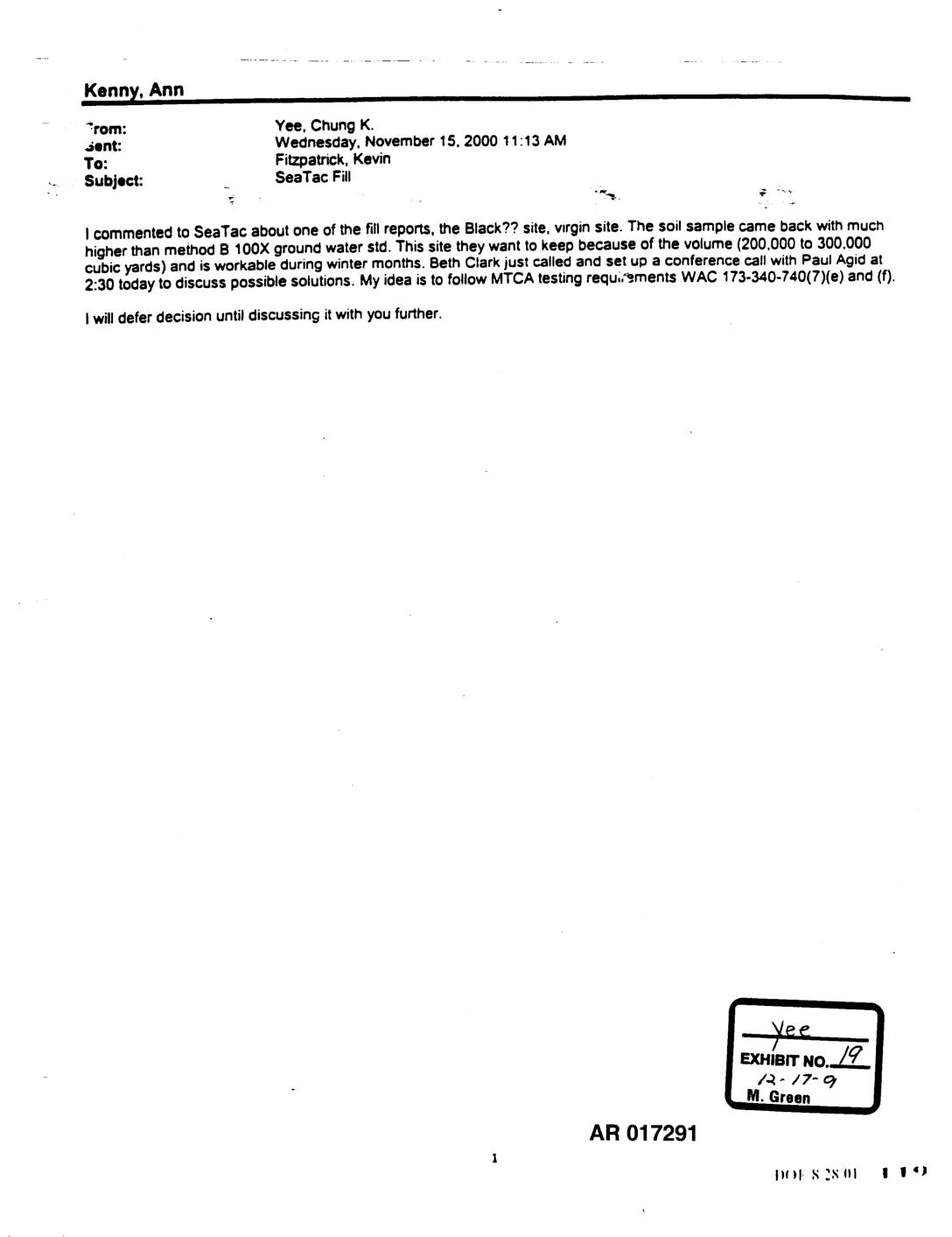 commented to SeaTac about one of the fill reports, the Black?? site, virgin site. The soil sample came back with much higher than method B 100X ground water std. This site they want to keep because of the volume (200,000 to 300,000 cubic yards) and is workable during winter months. Beth Clark just called and set up a conference call with Paul Agid at 2:30 today to discuss possible solutions. My idea is to follow MTCA testing requ;,_?mentsWAC 173-340-740(7)(e) and (f). will defer decision untildiscussing it with you further. + 1• M. Green AR 017291 I)+')I. ,_ ",_+il I I +9 EXH0019017291 -