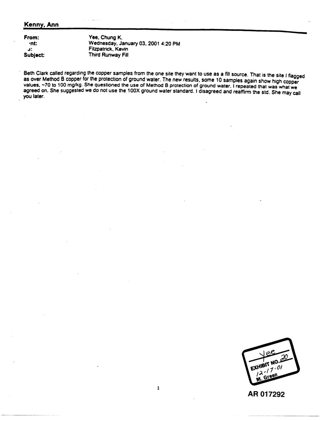 ,nt: Wednesday, January 03. 2001 4:20 PM j: Fitzpatrick. Kevin Subject: Third Runway Fill Beth Clark called regarding the copper samples from the one site they want to use as a fill source. That is the site I flagged as over Method B copper for the protection of ground water. The new results, some 10 samples again show high copper values, -70 to 100 rng/kg. She questioned the use of Method B protectionof ground water. I repeated that was what we agreed on. She suggested we do not use the 100X ground water standard. I disagreed and reaffirm the std. She may call you later. AR 017292 EXH0020017292 -