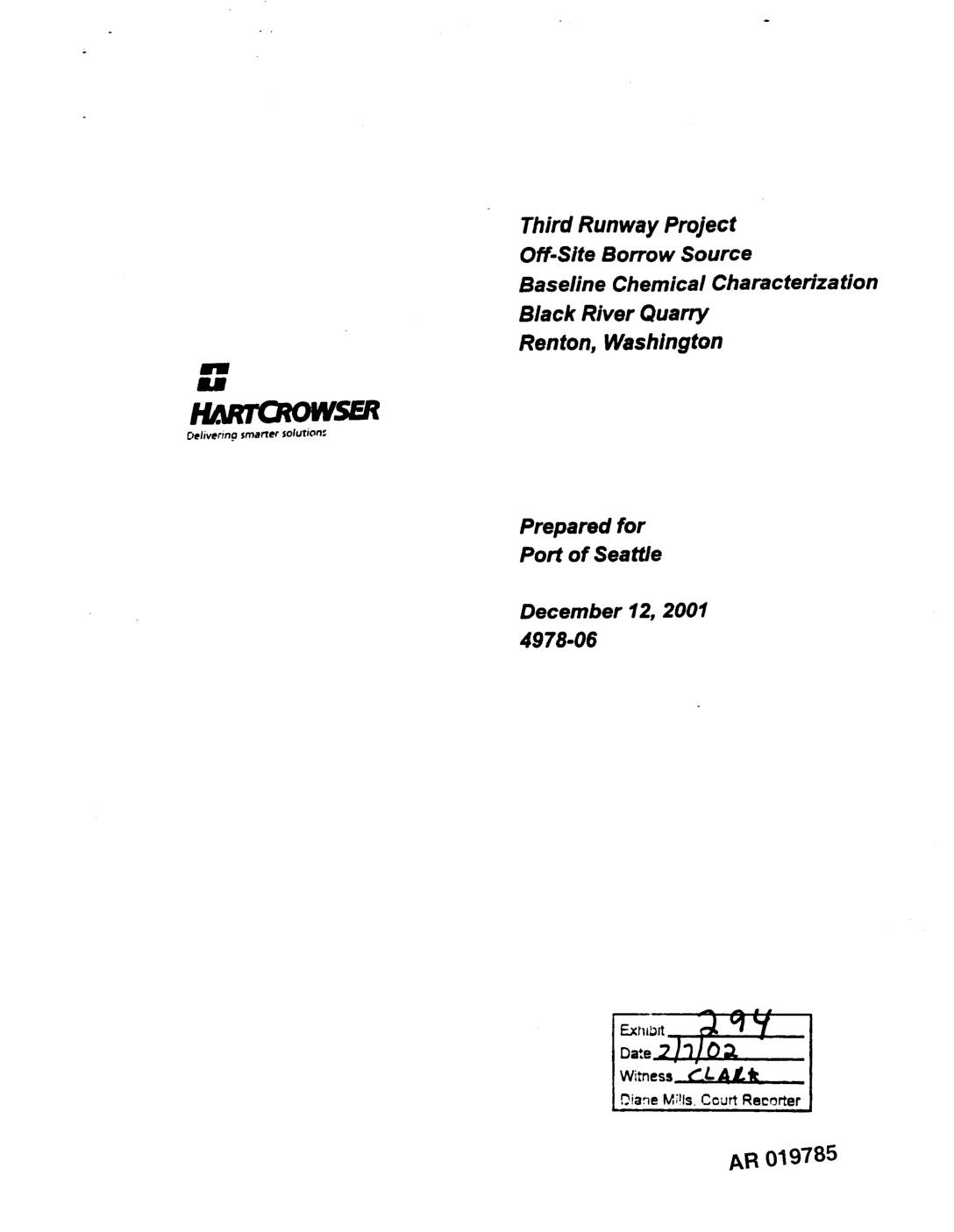 This data package presents information compiled by Hart Crowser foUowing the collection and chemical analysis of soil samples at the Black River Quarw for the Third Runway Project. The Black River Quarry is operated by City Transfer incorporated (CTI) and is a source of soil borrow fill material for the Third Runway embankment that is currently being constructed at the Sea-Tat International Airport. Soils at the Black River Quarry consist of native sand and gravel derived from glacial and related alluvial deposits. Work for the project was completed pursuant to our contract with HNTB dated May 1, 1998, as amended, and the sampling and analysis strategy described in the Hart Crowser proposal dated October 5, 2001. Hart Crowser collected the samples on October :3, 2001, at the stockpile locations identified on Figure 1. All site sampling work was conducted following approval and site access authorization from CTI and the Black River Quarry personnel. The objective of the pit sampling and analysis was to perform a baseline chemical characterization of in situ soils from active portions of the Black River Quarry. The soils were analyzed for total metals (priority pollutant metals plus barium) and total petroleum hydrocarbons. Additionally, Synthetic Precipitation Leaching Procedure (SPLP) analyses were conducted for any metal with a total metals concentration that exceeded fill screening criteria listed in the Port of Seattle's (Port's) Section 401 Water Quality Certification (Order #1996-4-0325, Amended -1) dated September 21, 2001. Six representative soil samples from the Black River Quarry were submitted for… -
