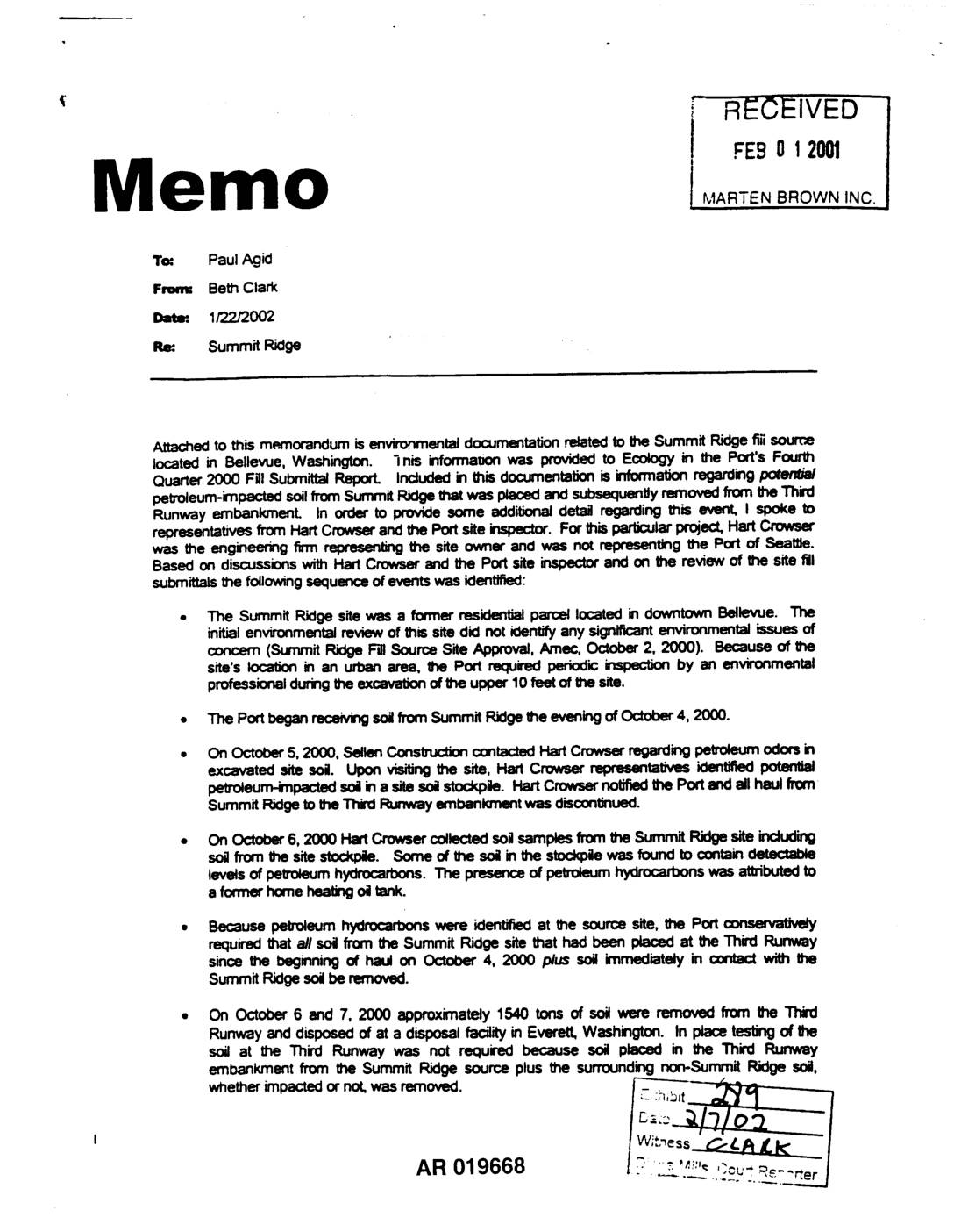 Attachedto this memorandum is erwitortmentaldocumentationrelated to the Summit Ridgeflii source located in Bellevue, Washington. 3nis informaoon was provided to Ecology in the Port's Fourth Quarter 2000 Fill Subrnit_ Report. Included in this documentationis informationregarding petroleum-impactedsoilhorn Summit Ridge that was placed and subsequentlyremoved from the Third Runway embankmenL In order to provide some additional detail regarding this event, I spoke to representativesfrom Hart Crowserand the Portsite inspector. For thisparticularproject, Hart Crowser was the engineering firm representingthe site owner and was not representing the Port of Seattle. Based on discussionswith Hart Crowser and the Port site inspectorand on the review of the site fill submittals_ followingsequence of eventswas identified: • The Summit Ridge site was a former residential parcel located in downtown Bellevue. The initial environmentalreview of this site did not identify any significantenvironmental issues of concern (Summit Ridge F'¢ Source Site Approval, Amec, October 2, 2000). Because of site's Iocatk:min an urban area, the Port requl'ed periodic inspectionby en environmental professionalduringthe excavat_n of the upper 10feet of the site. • The Port began receN_ soilfromSummit Ridgethe evening of October 4, 2000. • On October 5, 2000, Setlen ConstructioncontactedHart Crowserregarding peVoleum odors in excavated site sol Upon visitingthe site, Hart Crowser representatives identifiedpotential petroleum-impactedsol in a site soilstockple. Hart Crowsernotifiedthe Port and all haul from Summit Ridge to the Th_ Runway embankment was discontinued. • On October 6, 2000 HartCrowser colkcted sol samples from_ Summit Ridgesite induding sol from _e site stockple. Some of the sol in the stockpie wes found to…