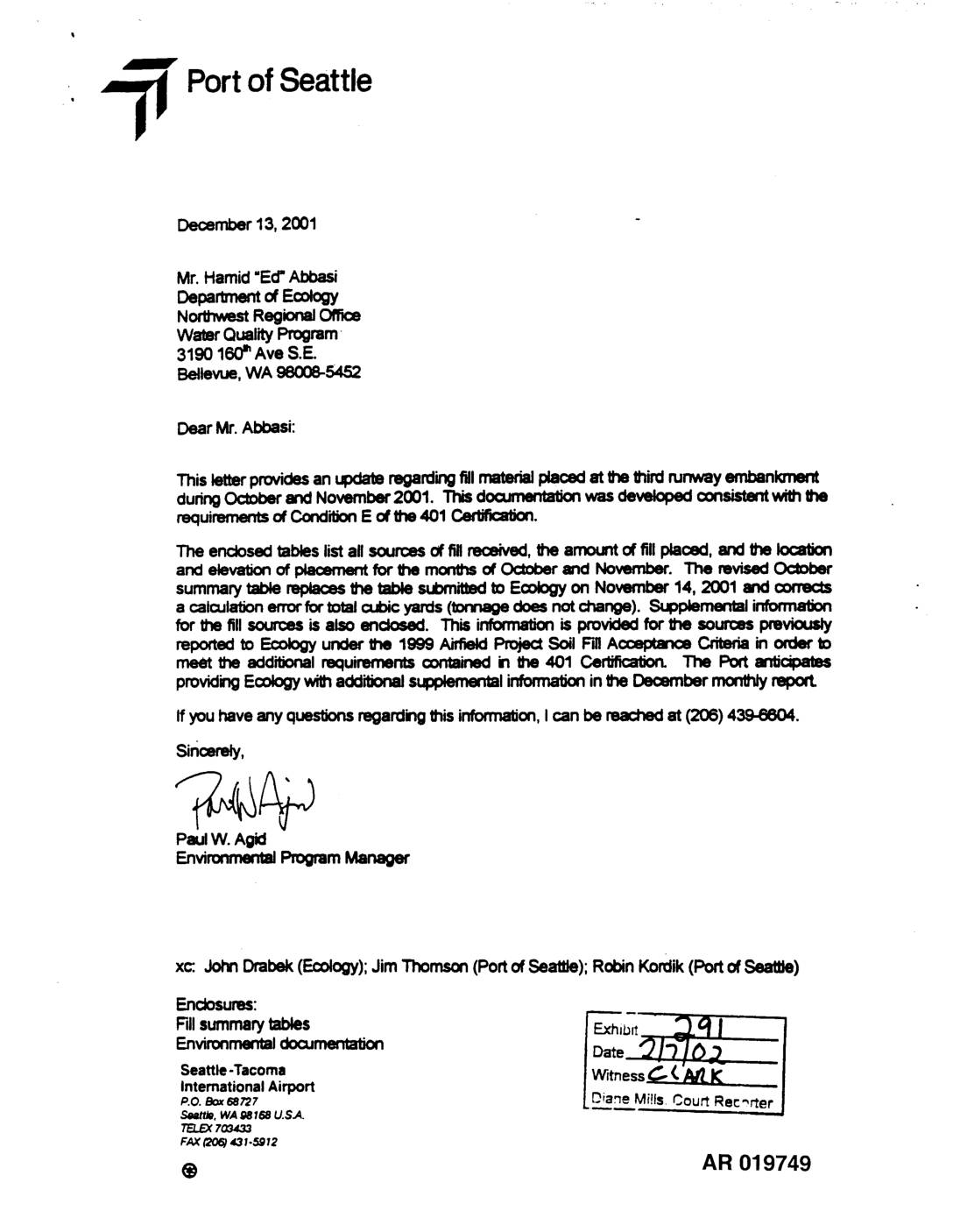 Environmental Planner 4 in the Northwest Regional Office (NWRO). I have held that position since mid-January, 2002. Prior to transferring to my current position, I was an Environmental Specialist 4 in the NWRO's Shorelands and Environmental Assistance (SEA) program. A copy of my resume is attached to my testimony as Attachment A. 2. Ecology's review of the Port's Sea-Tac International Airport (STIA) Master Plan Update Improvements began sometime in 1995 or 1996. The Port filed an initial Joint Aquatic Resources Permit Application (JARPA) to the U.S. Army Corps of Engineers (Corps) and Ecology in December, 1997. On July 20, 1998, Ecology issued a Clean Water Act § 401 Certification (401 Certification) for the project. That certification was later withdrawn when the Port discovered additional wetlands that would be impacted. The Port submitted a second JARPA in September, 1999, but withdrew that application in September, 2000, shortly before the expiration of the one-year decision deadline imposed by the Clean Water Act. On October 25, 2000, the Port filed a new JARPA for the project with the Corps and Ecology. A public hearing on the Port's application was held on January 26 and 27, 2001, and 52 day written public comment period provided. Ecology continued to receive and review comments on the Port's project beyond the expiration of the formal comment period. 3. I have been the 401 Certification Reviewer for the Port of Seattle's (Port's) 401 Certification application since late October, 2000. With the assistance of the team of experts assembled… -
