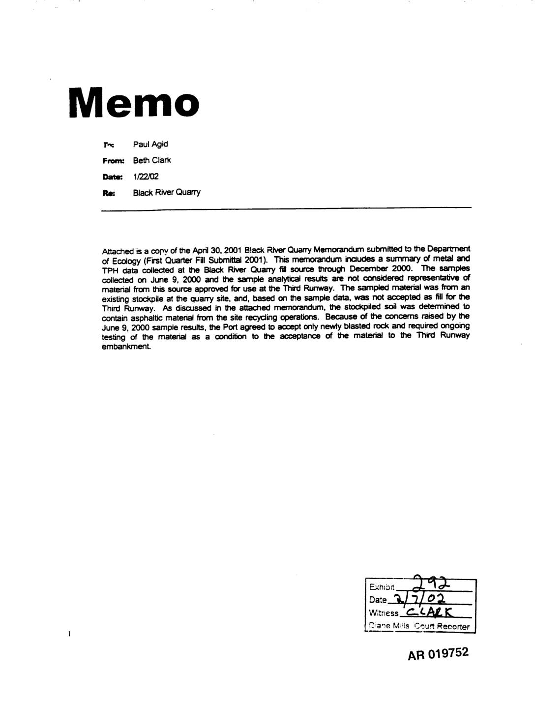 Attached is a copvof the April30. 2001 B!ackRiver QuarryMemorandumsubmittedto the Department of Ecology(Frst Quarter F'dlSubmittal2001). This memorandum includes a summary of metal and TPH data collected at the Back River Quarry fill source through December 2000. The samples collected on June 9, 2000 and ttle sample analyticalresults are not considered representative of materialfrom this sourceapproved for use at the Third Runway. The sampled material was from an existingstockpileat the quarrysite, and, based on the sample data, was not z-_-<_ted as fill for the Third Runway. As discussedin the attached memorandum, the stockpiled soil was determined to contain asphalt¢ material from the site recycling operations. Because of tt_econcerns raised by the June 9, 2000 sample results,the Port agreed to acceptonly newly blasted rock and required ongoing testing of the material as a condit_ to the acceptance of the material to the Third Runway embankmenL Witr_¢ss ____.L._" I_ _ia,_e Mi!Is C,_u_ Re_orter AR 019752 Port of Seattle Memo T= Paul Agid From: Beth Clark co: Bizabeth Leavitt,Jim 04/30/01 Re: BlackPJvarQuarry Rockaggregate was importedto the Third Runway embankmentfrom the Back River Quam/during AugustthroughOctober2000. The site, owned by Stoneway Rock & Recyc_g, also operatesas a o0no'ete crushingandrocyctingc_'tter. Blastingand o'ushingof bedrock _ from the qua'ry producesaggregatethat is usedfor various_ projectsin the PugetSound. Chemical_ was conductedonsamplesof _ aggregate by AMEC, environmental_t to the supplierCity Transfer, Inc.(CTI). The initialtestresultsfor thissitewere submittedto Ecologyin the Port'sThird Quarterly Report2000. On _ request of tt_ Port, AMEC conducte¢ladditionalchemical test_g on the aggregate. These test rasu_ have been discussedwi_ Mr. Chung Yee… -