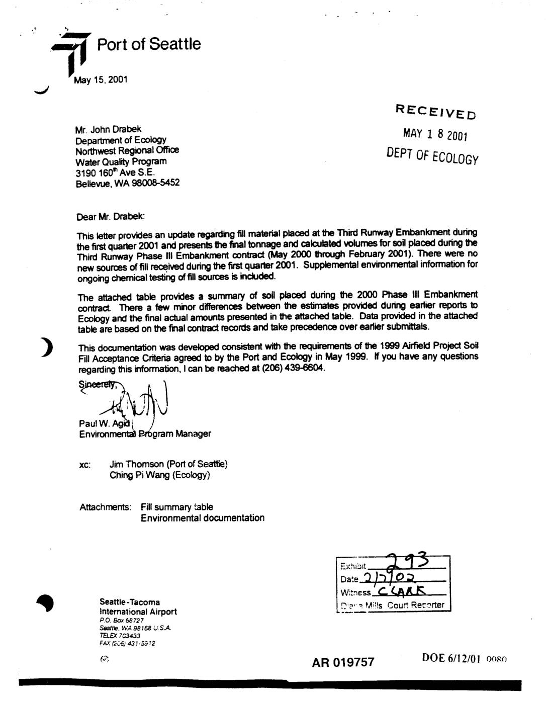 the flint quarter2001 andpresentsthe final tonnageand calculatedvolumesfor soilplaced duringthe Third Runway Phase III Embankmentcontract(May 2000 through February2001). There were no new soumesof fill receivedduringthe firstquarter2001. Supplementalenvironmentalinformationfor ongoingchemicaltestingoffill sourcesis included. The attached table providesa summary of soil placed during the 2000 Phase III Embankment co,,[,act. There a few minordifferencesbetween the eslbrBtes providedduringearlier reportsto Ecologyandthe final actualamountspresented inthe attachedtable. Data providedin the attached table arebased on the finalconlxactrecordsand take precedenceover earliersubmittals. This documentationwas developedconsistentwiththe requirementsof the 1999 AirfieldProjectSoil FillAcceptanceCriteriaagreed to by the Port and Ecologyin May 1999. ffyou have any questions regardingthis information,Ican be reachedat (206) 439-6604. PaulW. Agi¢'li J EnvironmentalP-,rbgramManager xc: Jim Thomson (Portof Seatl_) ChingPi Wang (Ecology) Attachments: Fillsummarytable Environmentaldocumentation Da:e3 )")'_O Seattle-Tacoma InternationalAirport r?_, _ Mi!Is Court.Retorter P.O. BOX68727 Seattle, WA 981F-_b'.S.A. TELEX?C3433 FAX£2;...6)437.5312 _'_ AR 019757 DOE6/12/0! oo_c_ May 15, 2001 Mr. JohnDrabek Departmentof Ecology NorthwestRegionalOffce Water QualityProgram 31.90160=Ave S.E. Bellevue,WA 98008-5452 Dear Mr. Drabek: This letterprovidesan updateregardingfillmaterialplacedat theThird Runway Embankment duringthe firstquarter 2001 and presentsthe final tonnageand calculated volumesfor soil placed during the Third Runway Phase III Embankment contract (May 2000 through February2001). There were no new sources of flU received during the first quarter 2001. Supplemental environmental information for ongoing chemical testing of fill sources is included. The attached table provides a summary of soil placed during the 2000 Phase III Embankmentcontract. There a few minordifferencesbetweentheestimates providedduring J earlierreportsto Ecologyand the final amountspresented the attached table. Dataactual in provided inthe attached table are based on the final contractrecordsand take precedence overearliersubmittals. This documentationwas developed consistentwith the… -