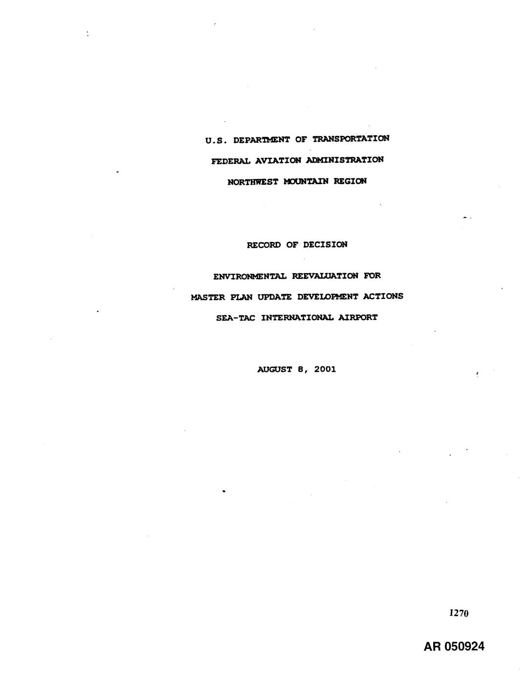 Four years ago, on July 3, 1997, I signed a Record of Decision (ROD) approving Federal Aviation Administration (FAA) actions providing support for various Master Plan Update (MPU) development actions proposed by the Port of Seattle (POS), including a controversial third runway project. The 1997 ROD relied upon a Final Environmental Impact Statement (FEIS) approved by the FAA on February 1, 1996, and a Supplemental EIS (SEIS) approved by the FAA on May 13, 1997. The instant year-2001 ROD makes the determination that it is not necessary to further supplement the 1996 and 1997 EIS documents at this time, to account for subsequent refinements to the MPU projects and new _ information relating to environmental impacts of these projects. It is not uncon_non during airport design and development, in the period between initial FAA approval of federal actions supporting airport projects and the completion of those projects, for new environmental information to come to the attention of the FAA. Likewise, it is not uncommon for an airport sponsor to propose and make design refinements to - previously-approved projects as those projects proceed towards the construction phase. This is particularly true when the airport development plan involves multiple separate projects proposed to be completed in several stages over a lengthy period of time. At 40 CFR Part 1500, the Council on Environmental Quality (CEQ) has promulgated regulations for implementing the procedural provisions of the National Environmental Policy Act. Section 1501.9(c)(1) provides that an agency shall prepare supplements to final environmental impact…