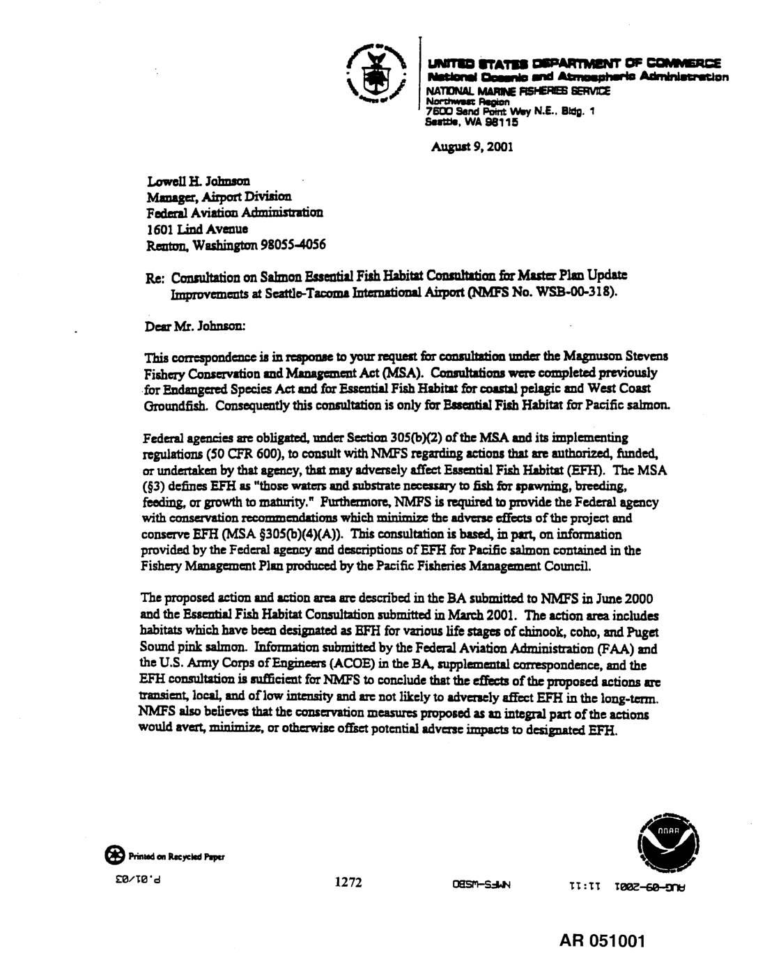 Re: Consulmion on Salmon F.umtbl Fish Habitat _on f_r Mastm"Plm Update T+-_n_vmmmatsat Seattlo-Tmmma Immmional _ (NMFS No. WSB-00-318). Dear Mr. Johnson: This rJz,re_ondeace k in n:sponse to your request far caamdmion under the Ma_uson Stm,ens Fithery Conservation lad Management Act ('MSA). _om were completed previously •for Endangered Species Act and for Essm_l Fish Habitat for costal pedant and West Coast Gmundfish. Consequently this consultmPionis only for P._sentiaIFish Habitat for Pac/fic salmon. Federal agencies are obligated, m2derSection 305Cv)(2) of the MSA and its implementing regulatiuns(50CFR600),toconsultwithNMFSregardingactionsthatareauthorized,funded. or underteken by that agency, tluttmay adversely affect Emmfial Fish Habitat (EFH). The MSA (§3) defines _ as "those waters and suba,h-te neceasary to fir& for spawning, breeding, feeding, or growth to w*,,,ity." Furthermore. NMFS is required to provide the Federal agency with conservation recommendations which minimize the adverse efl'ec_ of the project and conserve EFH (MSA §305(b)(4XA)). This consultation k based, in part, on information provided by the Federal agency and descriptions of EFH fin"Pacific salmon contained in the Fishery Management Plan produced by the Pacif_ Fitheries Management Cotmcfl. The proposed action and action area ere described in the BA submitted to NMFS in June 2000 and the Essential Fish Habitat Consultation submitted in March 2001. The action area includes habitats which have bee_ldesignated as HH-Ifor various life stages of chinook, coho, and Puget Sound pink salmon. Int'u,wation sub,tied by the Federal Aviation Ad_n/stration (FAA) and the U.S. Army Corps ofEnginee_ (ACOE) in the BA, supplemental correspondence, and the EFH consultation is sufficient far NMFS… -