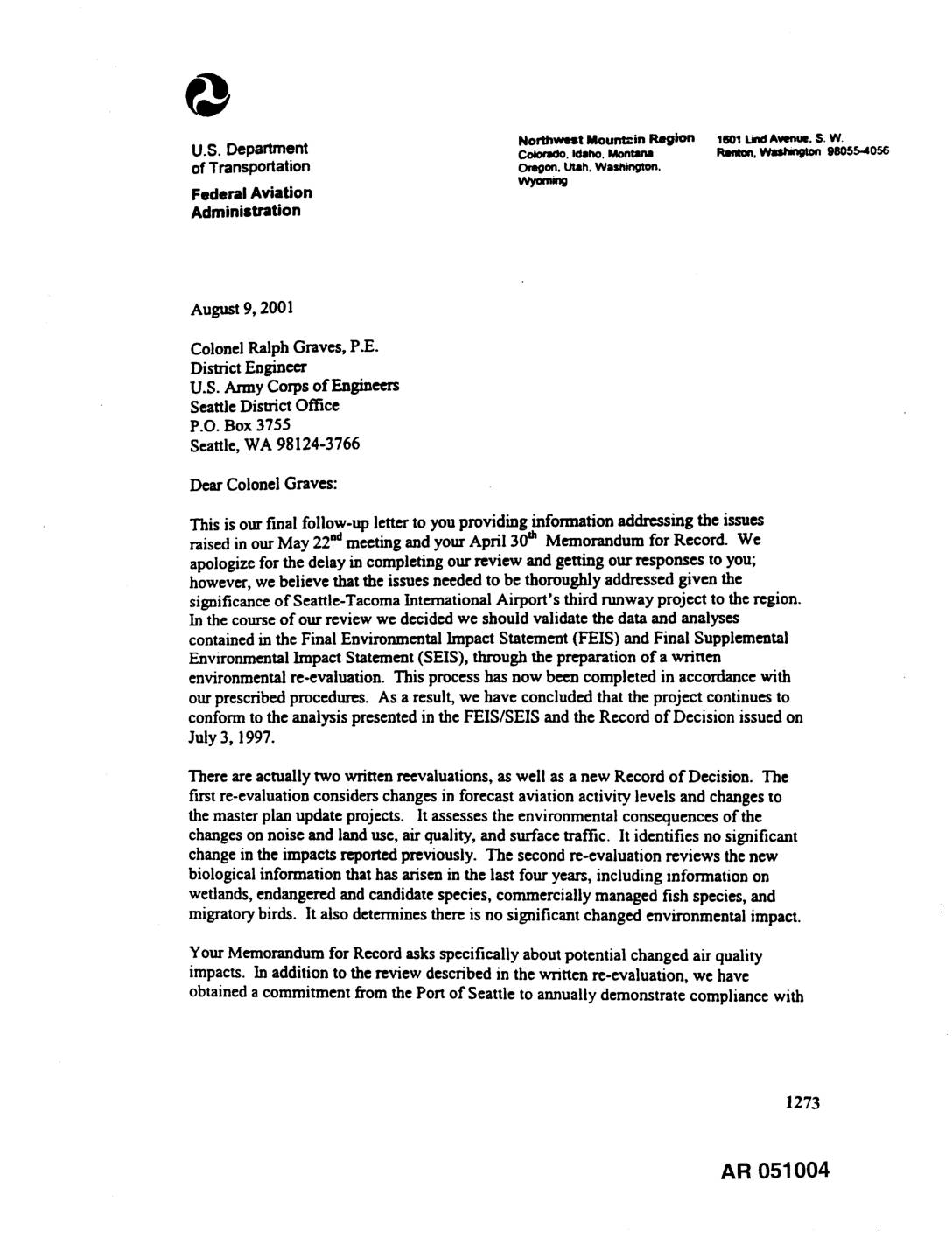 Northwest Mount=in Region 1601 Lind Avenue. S. W. U.S. Department _. _=ho.Mont=m R=me,W==M_eeeS0S_-40_ of Transportation o_wee.Ut=h,W=shn_ton, Federal Aviation wyom_ Administration August 9, 2001 Colonel Ralph Graves, P.E. District Engines" U.S. Army Corps of Engineers SeattleDistrict Office P.O.Box 3755 Seattle,WA 98124-3766 DearColonelGraves: Thisisourfinalfollow-uplettertoyouprovidinginformationaddressingtheissues raisedinourMay 22_ meetingandyourApril30_ Memorandum forRecord.We apologizeforthedelayincompletingourreviewandgettingourresponsestoyou; however,we believethattheissuesneededtoI_thoroughlyaddressedgiventhe significanceofSeattle-TacomaInternationalAirport'sthirdrunwayprojecttotheregion. Inthecourseofourreviewwe decidedwe shouldvalidatethedataandanalyses containedm theFinalEnvironmentalImpactStatement(FEIS)andFinalSupplemental EnvironmentalImpactStatement(SEIS),throughthepreparationofa written environmentalre-evaluation.Thisprocesshasnow beencompletedinaccordancewith ourprescribedprocedures.As aresult,we haveconcludedthattheprojectcontinuesto conformtotheanalysispresentedintheFEIS/SEISandtheRecordofDecisionissuedon July3,1997. Thereareactuallytwowrittenreevaluations,aswellasanew RecordofDecision.The firstre-evaluationconsiderschangesinforecastaviationactivitylevelsandchangesto themasterplanupdateprojects.Itassessestheenvironmentalconsequencesofthe changeson noiseandlanduse,airquality,andsurfacetraffic.Itidentifiesno significant changeintheimpactsreportedpreviously.The secondre-evaluationreviewsthenew biologicalinformationthathasariseninthelastfouryears,includinginformationon wetlands,endang_'exiandcandidatespecies,commerciallymanagedfishspecies,and migratorybirds.Italsodeterminesthereisno significantchangedenvironmentalimpact. YourMemorandum forRecordasksspecificallyaboutpotentialchangedairquality impacts.Inadditiontothereviewdescribedinthewrittenre-evaluation,we have obtainedacommitment_om thePortofSeattletoannuallydemonstratecompliancewith 1273 AR 051004 de-minimis threshold levels. This commitment will be a condition of grants for the master plan update improvements. As a result of these written re-evaluations, we have concluded that the recent MPU project modifications and the new information concerning environmental impacts do not warrant prt.parationof a new SF__. The .-nclosed Record of Decision, to which the re- evaluations are appended,describes the analyses and conclusions. We hope this information addresses your questions and concerns with respect to therw issues. If you have any furtherquestions, do not hesitate to contact our office. Sincerely, Lowell H. Johnson Manager, Airports Division Northwest Mountain Region CC" Muffy Walker, COE Regulatory Branch bcc: ANM_I0 SEA-ADO AR 051005 EXH1273051004 EXH1273051005 -