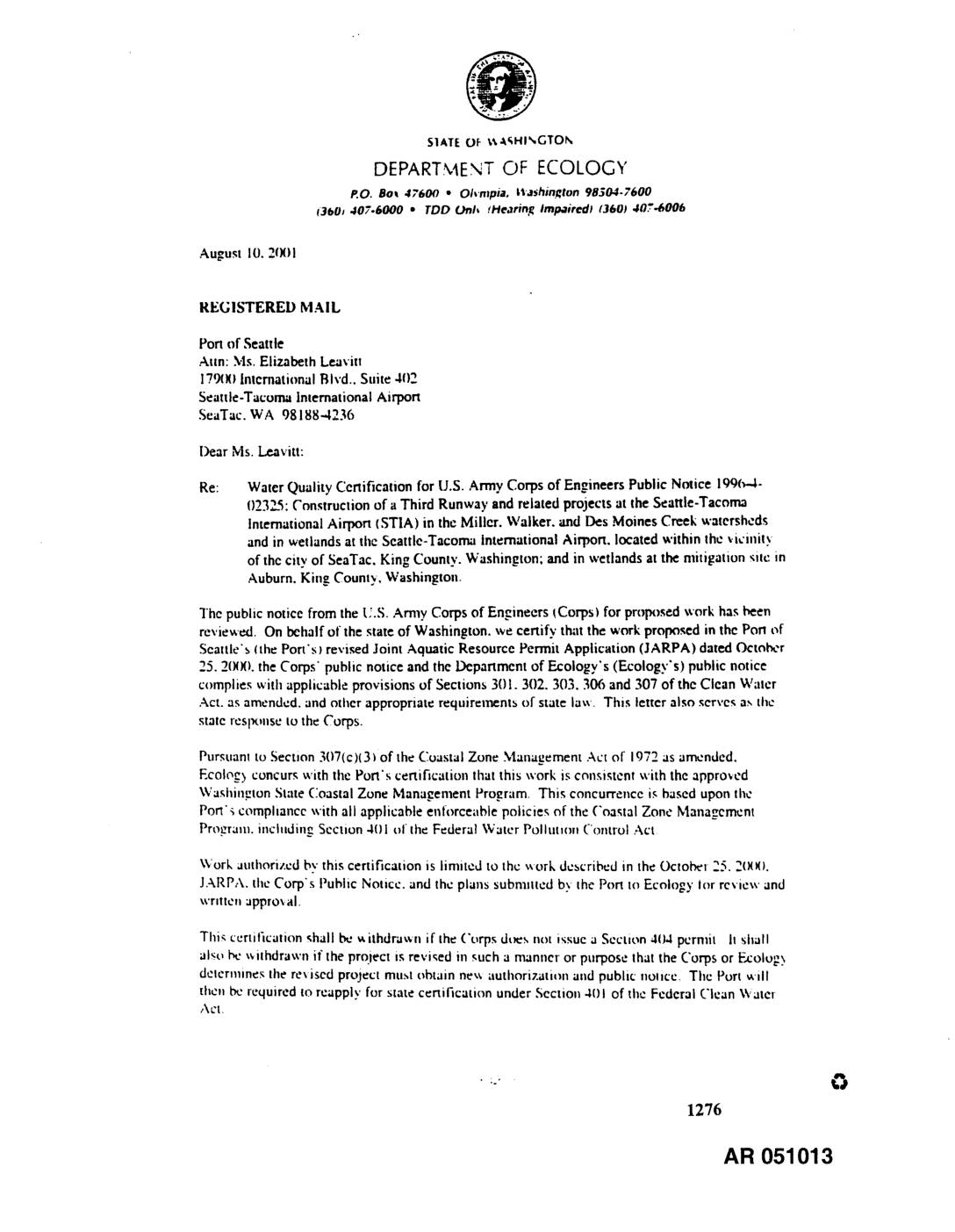 Re: Water Quality Certification for U.S. Army Corps of Engineers Public Notice 1990-4- 023_'i: Construction of a Third Runway and related projects at the Seattle-Tacoma InternationalAirport (STIA) in the Miller. Walker. and Des Moines Creek watersheds and in wetlands at the Seattle-Tacoma InternationalAirport. located within Ihc _.icmity of the city of SeaTac. King County. Washington; and in wetlands at the mitigation site in Auburn. King County, Washington. The public notice from the U.S. Amly Corps of Engineers ICorps) for proposed work has been reviewe..d.On behalf of the state of Washington. we certify that the work proposed in the Pan of Seattle's (the Port's) revised Joint Aquatic Resource Permit Application (JARPA) dated October 25.2(XX). the Corps"public notice and the Department of Ecology's (Ecology's) public notice complies with applicable provisions of Sections 301. 302. 303.306 and 307 of the Clean Waler Act. as amended, and other appropriate requirements of state law. This letter also serves as tile state reslxmSe to the Corps. Pursuant to Section 307(c)13)of the Coastal Zone Management Act of 1972 as amended. Ecolog) concurs with the Port's certification that this work is consistent with the approved Wasiwlgton State Coastal Zone Management Program This concurrence is based upon tile Port'_ comphancc with all applicable enforceable policies of the Coastal Zone Management Program. inch,drag Section 401 tfl the Federal Water Pollutitm Control Act _,"orkauthorized by this certification is limited to the work described in the October 2.';.2(X_(). JARPA. tileCarp's Public Notice. and the plans sustained by the Port to Ecology lot… -