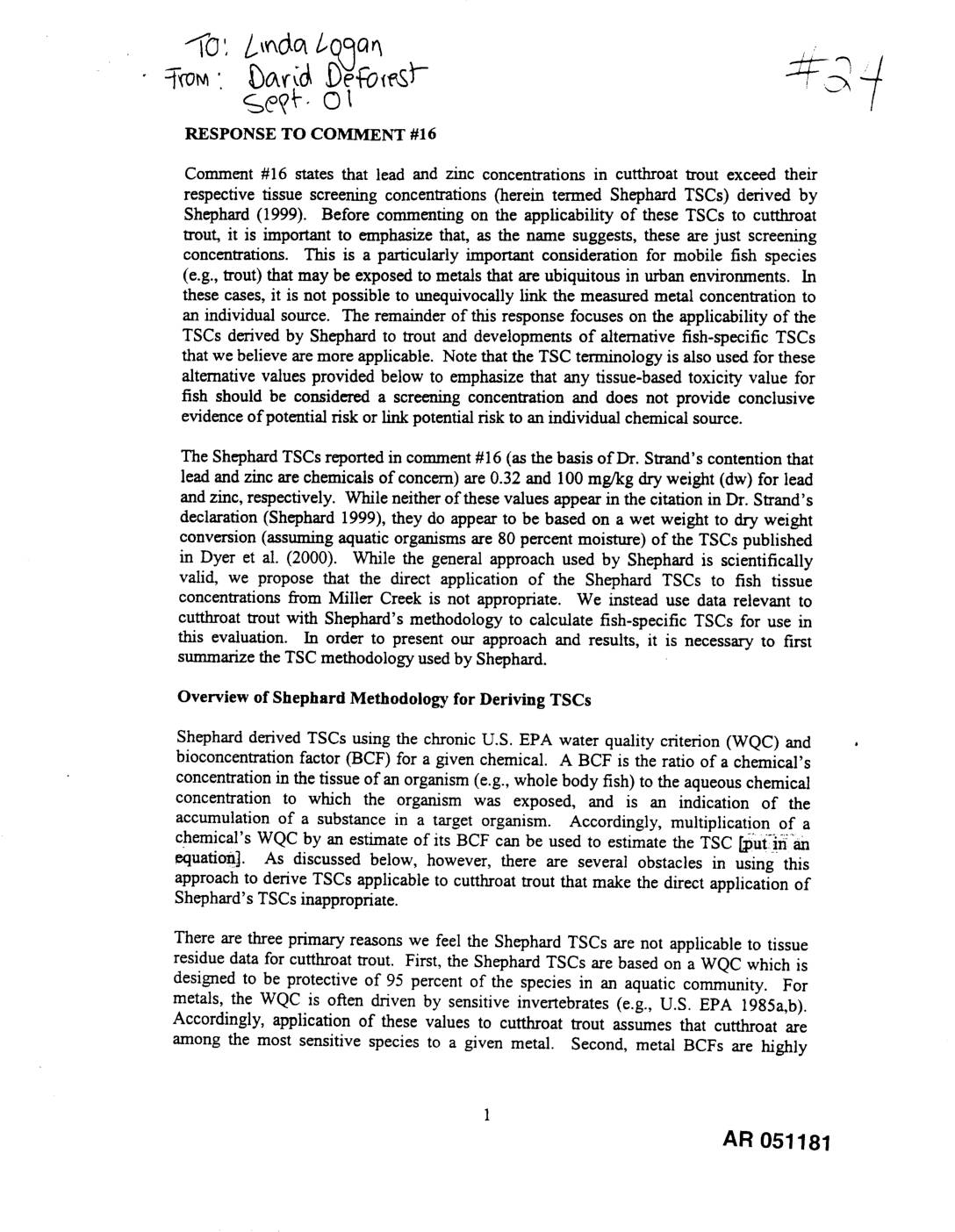 Comment #16 states that lead and zinc concentrations in cutthroat trout exceed their respective tissue screening concentrations (herein termed Shephard TSCs) derived by Shephard (1999). Before commenting on the applicability of these TSCs to cutthroat trout, it is important to emphasize that, as the name suggests, these are just screening concentrations. This is a particularly important consideration for mobile fish species (e.g., trout) that may be exposed to metals that are ubiquitous in urban environments. In these cases, it is not possible to unequivocally link the measured metal concentration to an individual source. The remainder of this response focuses on the applicability of the TSCs derived by Shcphard to trout and developmertts of alternative fish-specific TSCs that we believe are more applicable. Note that the TSC t_a'ninology is also used for these alternative values provided below to emphasize that any tissue-based toxicity value for fish should be consid_l a screening concentration and does not provide conclusive evidence of potential risk or link potential risk to an individual chemical source. The Shephard TSCs reported in comment #16 (as the basis of Dr. Strand's contention that lead and zinc are chemicals of concern) are 0.32 and 100 mg/kg dry weight (dw) for lead and zinc, respectively. While neither of these values appear in the citation in Dr. Strand's declaration (Sh_hard 1999), they do appear to be based on a wet weight to dry weight conversion (assuming aquatic organisms are 80 percent moisture) of the TSCs published in Dyer et al. (2000). While… -