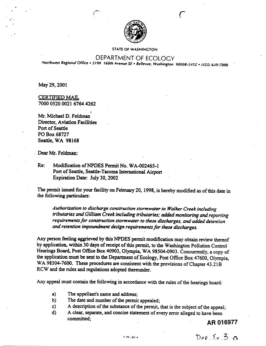 Northwest Regional Office • 3190 160th Avenue SE . Bellevue, Washington 98008-5452 • (425) 649-7000 May 29, 2001 CERTIFIED MAIL 7000 0520 0021 6764 4262 ( Mr. Michael D. Feldman Director, Aviation Facilities Port of Seattle PO Box 68727 Seattle, WA 98168 •Dear Mr. Feldman: Re: Modification of NPDES Permit No. WA-002465-I Port of Seattle, Seattle-Tacoma International Airport Expiration Date: July 30, 2002 The permit issued for your facility on February 20, 1998, is hereby modified as of this date in the following particulars: Authorization to discharge construction stormwater to Walker Creek including tributaries and Gilliam Creek including tributaries; added monitoring and reporting requirements for construction stormwater to these discharges, and added detention and retention impoundment design requirements for these discharges. Any person feeling aggrieved by this NPDES permit modification may obtain review thereof by application, within 30 days of receipt of this permit, to the Washington Pollution Control Hearings Board, Post Office Box 40903, Olympia, WA 98504-0903. Concurrently, a copy of the application must be sent to the Departmentof Ecology, Post Office Box 47600, Olympia, WA 98504-7600. These procedures are consistent with the provisions of Chapter 43.21B RCW and the rules and regulations adopted thereunder. Any appeal must contain the following in accordance with the rules of the hearings board: a) The appellant's name and address; b) The date and number of the permit appealed; c) A description of the substance of the permit, that is the subject of the appeal; d) A clear, separate, and concise statement of… -