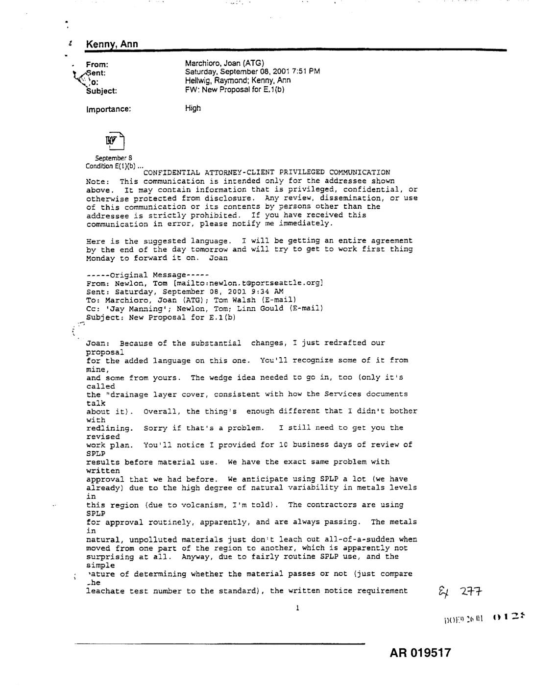 ent: Saturday. September 08, 2001 7:51 PM o: Heilwig, Raymond; Kenny, Ann Subject: FW: New Proposal for E.l(b) Importance: High Septem_r 8 Condi_on E(t)(b) ... CONFZDENTIAL ATTORNEY-CLIENT PRIVILEGED COMMUNICATION Note: This communication is intended only for the addressee shown above. It may contain information that is privileged, confidential, or otherwise protected from disclosure. Any review, dissemination, or use of this communication or its contents by persons other than the addressee is strictly prohibited. If you have received this communication in error, please notify me immediately. Here is the suggested language, i will be getting an entire agreement by the end of _he day tomorrow and will try to get to work first thing Monday to forward it on. Joan ..... Original Message ..... From: Newlon, Tom [mailto:newlonot@por_seat_le.org] Sent: Saturday, September 08, 2001 9:34 AM To: Marchioro, Joan (ATG); Tom Walsh (E-mail) Co: 'Jay Manning'; Newlon, Tom; Linn Gould (E-mail) Subject: New Proposal for E.l(b) ._ Joan: Because of the substantial changes, I just redrafted our proposal for the added language on this one. You'll recognize some of it from mine, and some from yours. The wedge idea needed to go in, ted (only it*s called the "drainage layer cover, consistent with how the Services documents talk about it). Overall, the thing's enough different that I didn't bother with redlining. Sorry if that's a problem. ! still need to get you the revised work plan. You'll notice I provided for I0 business days of review of SPLP results before material use.…