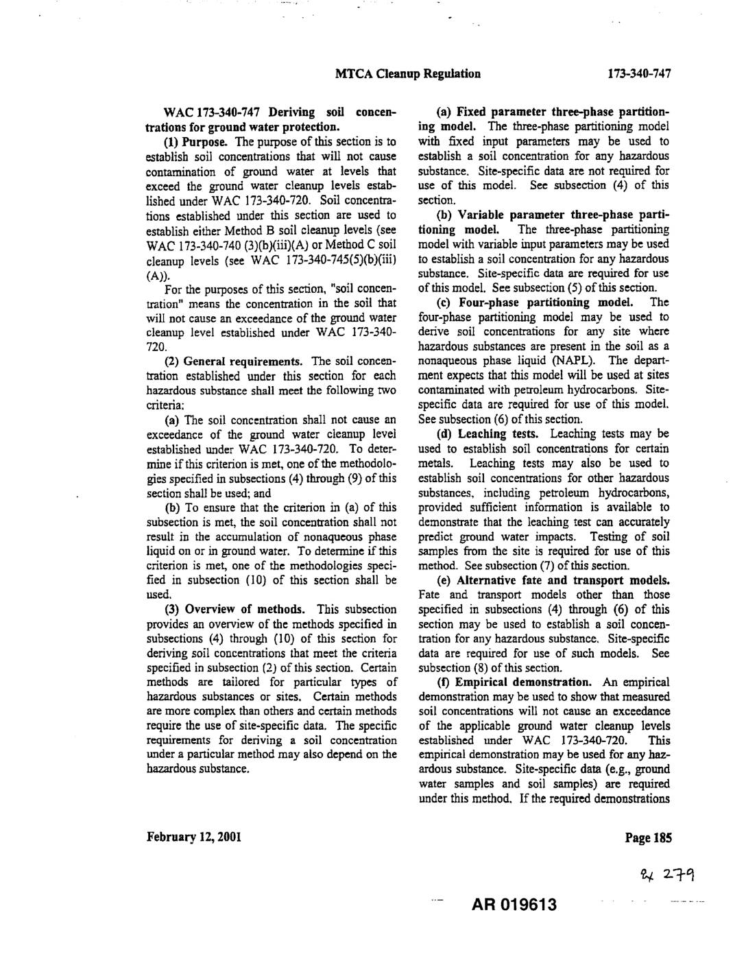 WAC 173-340-747 Deriving soft eoncen- (a) Fixed parameter three-phase partition- trations for ground water protection, ing model. The three-phase partitioning model (1) Purpose. The purposeof this section is to with fixed input parameters may be used to establish soil concentrations that wili not cause establish a soil concentration for any hazardous contamination of ground water at levels that substance. Site-specific data are not requiredfor exceed the ground water cleanup levels estab- use of this model. See subsection (4) of this lished under WAC 173-340-720. Soil concentra- section. tions established under this section are used to (b) Variable parameter three-phase patti- establish either Method B soil cleanup levels (see tioning model. The three-phase partitioning WAC 173-340-740 (3)(bXiii)(A) or Method C soil model with variable input parameters may be used cleanup levels (see WAC 173-340-745(5)(b)(iii) to establish a soil concentration for any hazardous (A)). substance. Site-specific data are required for use For the purposes of this section, "soil concen- of this model. See subsection (5) of this section. tration" means the concentration in the soil that (c) Four-phase partitioning model. The will not cause an exceedance of the ground water four-phase partitioning model may be used to cleanup level established under WAC 173-340- derive soil concentrations for any site where 720. hazardous substances are present in the soil as a (2) General requirements. The soil coneen- nonaqueous phase liquid (NAPL). The depart- tration established under this section for each ment expects that this model will be used at sites hazardoussubstance shall meet… -