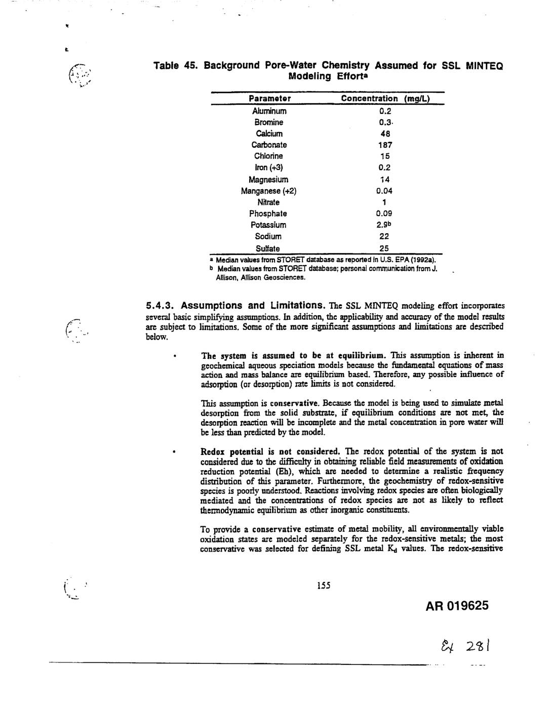 <,-', Table 45. Background Pore-Water Chemistry Assumed for SSL MINTEQ A l'-o _.-,.,- Modeling Efforta Parameter Concentration (rag/L) Aluminum 0.2 Bromine 0,3. Calcium 48 Carbonate 187 Chlorine 15 Iron(+3) 0.2 Magnesium 14 Manganese(+2) 0.04 Nitrate 1 Phosphate 0.0g Potassium 2.gb Sodium 22 Sulfate 25 a Mec_anvaluesfromSTORETdatabaseasreportedinU.S.EPA(1992a). b MedianvaluesfromSTORE-I"database;personalcommunicationfromJ. Allison,AllisonGeosciences. 5.4.3. Assumptions and Limitations. The SSL MINTEQ modeling effort incorporates several basic simplifying assumptions. In addition, the applicabi/it7 and accuracy of the model results are subject to limitations. Some of the more significant assumptions and limitations are described (: • "' below. • The system is assumed to be at equilibrium. This assumption is inherent in geochemical aqueous speciafion rood=Is because the fundamental equations of mass action and mass balance are equilibrium based. Therefore, any possible influence of adsorption (or desorption) zat¢ limits is not considered. This assumption is conservative. Because the model is being used to simulate metal desorption from the solid substrat=, ff equilibrium conditions are not met, the desorpdon reaction will be incomplete and the metal concentration in pore water will be less than predicted by the model. • Redox potential is not considered. The redox potential of the system is not considered due to the difficulty in obtaining reliable field measurements of oxidation reduction potential (Eh), which are needed to determine a realistic frequency distribution of this parameter. Furthermore, the geochemistry of redox-sensitive species is poorly understood. _acdons involving redox species are often biologically mediated and the concentrations of redox species are not as likely to reflect… -