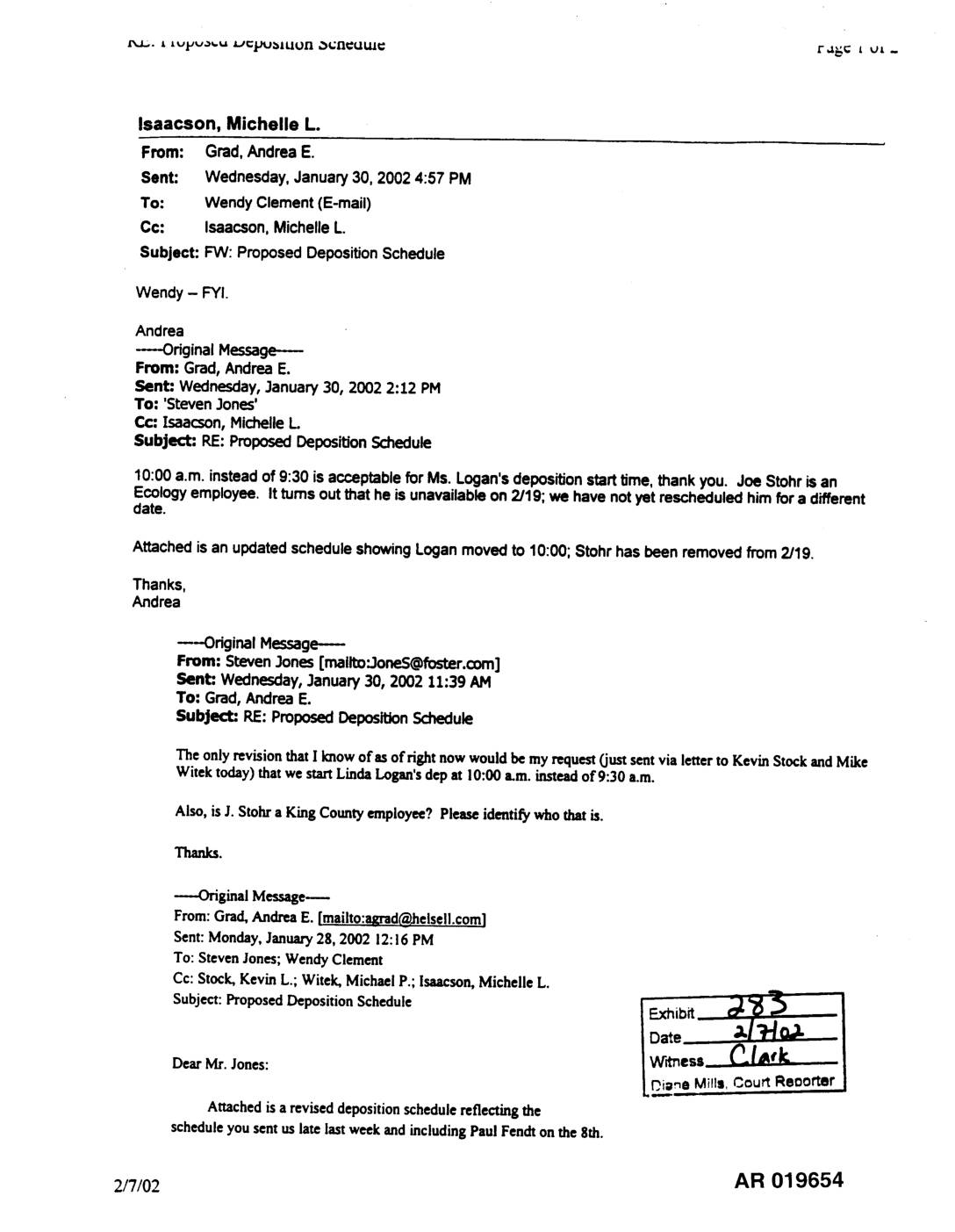 P_,. t tvwva_._a _.J_I.,_J_IUUN_¢ULU_ C_,_¢ I Vt - Isaacson, Michelle L. From: Grad, Andrea E. Sent: Wednesday, January 30, 2002 4:57 PM To: Wendy Clement (E-mail) Cc: Isaacson, Michelle L. Subject: FW: Proposed Deposition Schedule Wendy - FYI. Andrea -Original Message. From" Grad, Andrea E. Sent: Wednesday, January 30, 2002 2:12 PM To: 'Steven Jones' Cc: Lsaacson,Michelle L. Subject: RE: ProposedDeposition Schedule 10:00 a.m. instead of 9:30 is ac__eptablefor Ms. Logan's deposition start time, thank you. Joe Stohr is an Ecology employee. It turns out that he is unavailable on 2/19; we have not yet rescheduled him for a different date. Attached is an updated schedule showing Logan moved to 10:00; Stohr has been removed from 2/19. Thanks, Andrea ----Original Message--- From: Steven Jones [mailto'..loneS@foster.com] Sent:. Wednesday, January 30, 2002 11:39 AM To: Grad, Andrea E. Subject: RE: Proposed Deposition Schedule The only revision that I know of as of rightnow would be my request Oust sent via letter to Kevin Stock and Mike Witek today) that we startLinda Logan's dep at 10:00 a.m. instead of 9:30 a.m. Also, is J. Stohr a King County employee? Please identify who that is. Thanks. -: Original Message From:Grad, Andrea E. [mailto:agradc_helsell.com] Sent: Monday, January28, 2002 12:!6 PM To: Steven Jones; Wendy Clement Cc: Stock, Kevin L.; Witek, Michael P.; Isaacson, Michelle L. Subject: ProposedDepositionSchedule l Exhibit _ '_ "_ - m Iiw" e's C_IA,I: . Dearkru".Jones: L,mneMills. Court Reoorter. Attachedisa reviseddepositionschedulereflectingthe scheduleyousen us late last weekand includingPaulFendtonthe8th. 2/7/02 AR 019654 A_,.L,. A… -