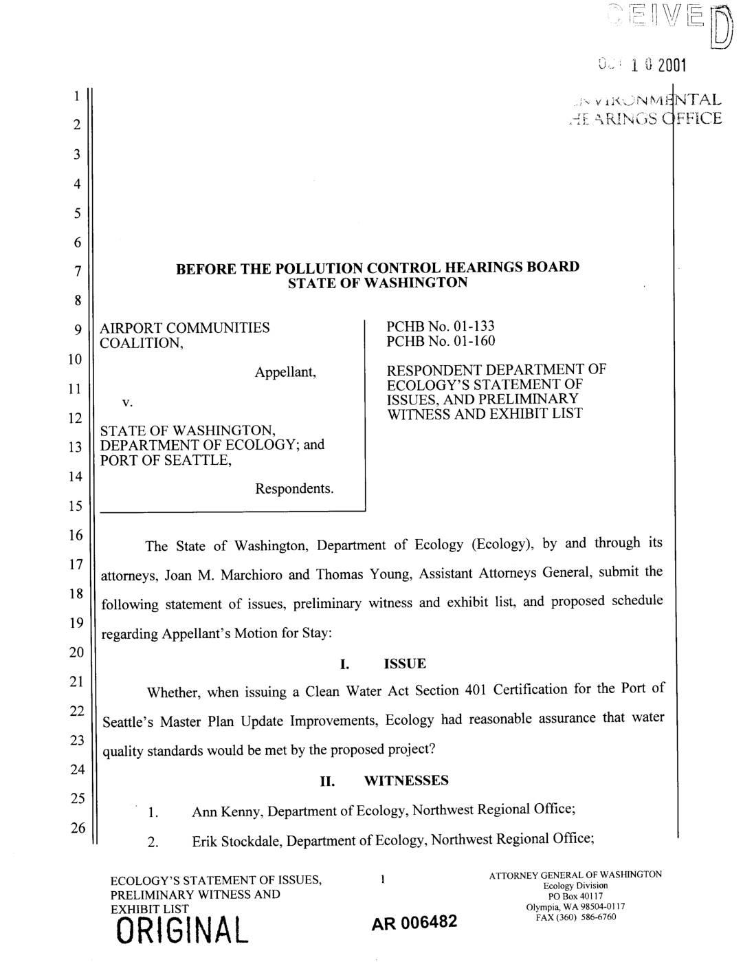 attorneys, Joan M. Marchioro and Thomas Young, Assistant Attorneys General, submit the following statement of issues, preliminary witness and exhibit list, and proposed schedule regarding Appellant's Motion for Stay: I. ISSUE Whether, when issuing a Clean Water Act Section 401 Certification for the Port of Seattle's Master Plan Update Improvements, Ecology had reasonable assurance that water quality standards would be met by the proposed project? II. WITNESSES 1. Ann Kenny, Department of Ecology, Northwest Regional Office; -