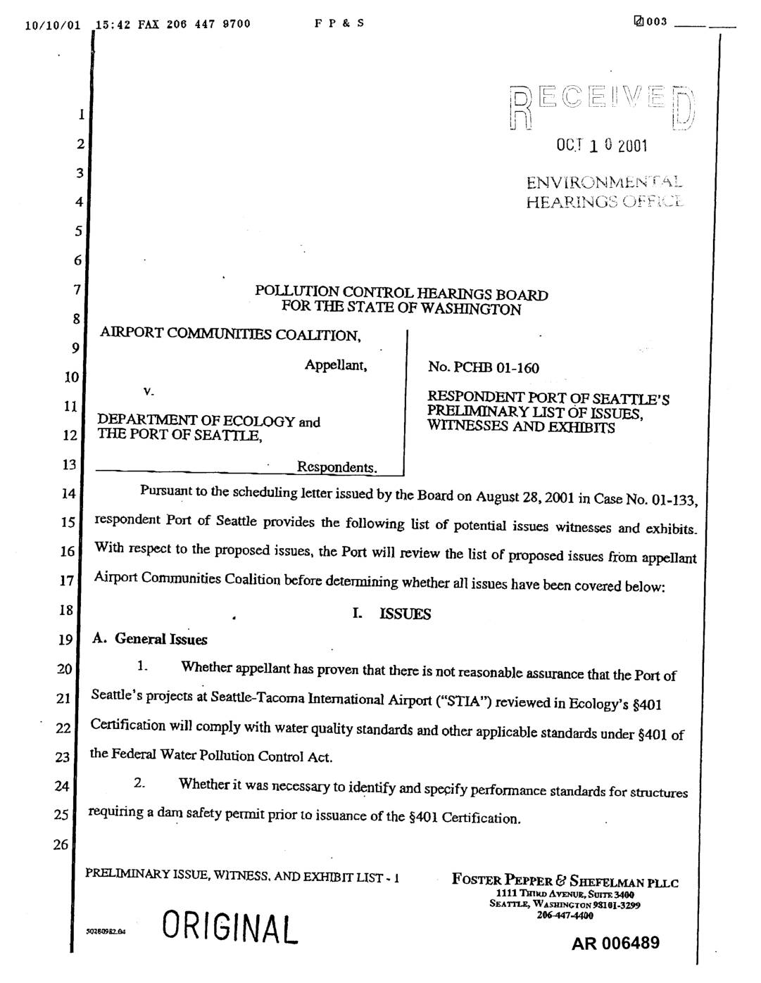 Pursuant to the scheduling letter issued by the Board on August 28, 2001 in Case No. 01-133, respondent Port of Seattle provides the following list of potential issues witnesses and exhibits. With respect to the proposed issues, the Port will review the list of proposed issues from appellant Airport Communities Coalition before determining whether all issues have been covered below: . I. ISSUES A. General Issues 1. Whether appellant has proven that there is not reasonable assurance that the Port of Seattle's projects at Seattle.-Tacoma International Airport ("STIA") reviewed in Ecology's §401 Certification will comply with water quality standards and other applicable standards under §401 of the Federal Water Pollution Control Act. 2. Whether it was necessary to identify and spc_fy performance standards for structures requiring a dam safety permit prior to issuance of the §401 Certification. PRELIMINARY ISSUE, WITNESS, AND EXHIBIT LIST - 1 FOSTER PEPPER _ SBXFELMAN PLLC 1111Tm_,DAvx_0F., SutTK3400 SEA_, Wasm_cToN 9S1al._2._ 206-447-4400 0RIGINAL 10110/01 15:42 FAX 206 447 9700 F P & S _004 3. Whether the Port's proposed projects arc consistent with the applicable terms of the Coastal Zone Management Act and Washington's Coastal Zone Management Program. 4. Whether Ecology complied with the State Environmental Policy Act ("SEPA") when reviewing the Port's projects for compliance with applicable standards under §401. 5. Whether the Port complied with the applicable requirements of SEPA. 6. Whether the Board has jurisdiction to review the Port's compliance with SEPA. 7. Whether the §40I Certification conforms to applicable law when it… -