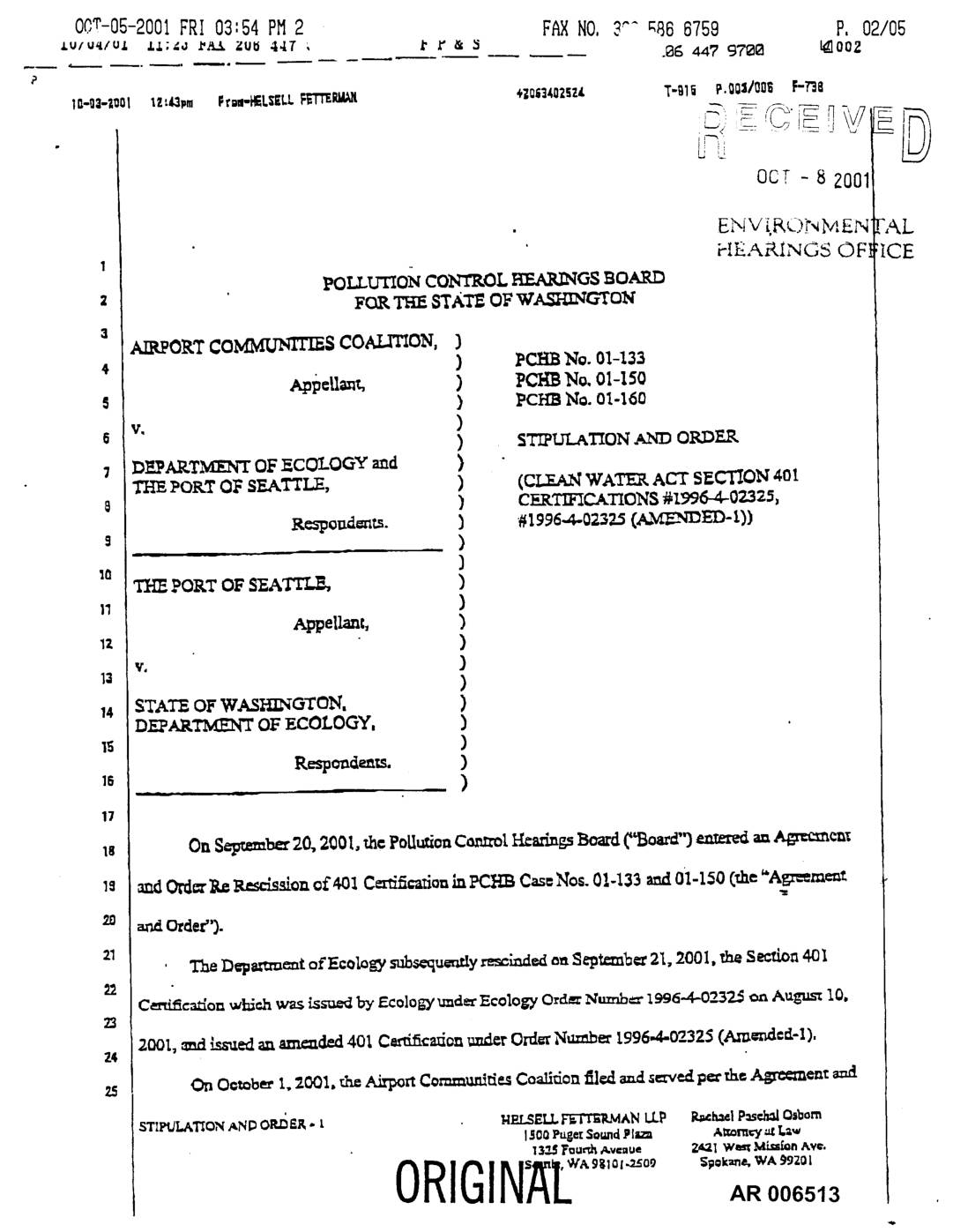 la-gl-lO01 IZ'._pm F_H-t_LIELL RrrT_wAIt _402_Z,tT.._lf p.@@_i/00g F-_@ oct - s zoal • ENV_.KO..r, MENFAL HEARING8 OF :iCE1 POLLUTIONCONTROLKEARINOSBOARD z FOR _ STATS OF W_GToN AIBgORTCOMMUNIT_S COALITION,) 4. ) _CHB'No.01-133 ApPcU_ ) PCHBNo,01-150 @ ) PCHB No.01-150 v, ) ) STIFUIA_ONAND ORDF.2, DF.PAKTMWNT OF.ECOI-OOY and ) T}_ I_ORTOY SF.ATTLE, ) (CLEAN WATI_ ACT SECT!ON 401 @ ) C__RTII_CATIONS#1996-4-02325, Rcspoud_s. ) _1996-4-023_(_ED- I)) s )m TI_ POET OF SEATT£_ ) ) Appellanc, ) Iz ) v. } ia ) STATS OF WAS_TGTON, ) DEFAR_ O1:ECOLOGY, ) I_ ) Resl_on_eam. ) IS __ )p. L Is On $_;r__-ber20,2001,_c PoLlutionCommI HcadngsBoard("Board")_ an&@_-cmcn_ IS m:z1Ord=ReB=clss[ono£401C=dS_fionMPCKBCas=Nos.0!-133_-dOi-lS0(_c_A_ern_nt TheD_arm_entof_col_,_u_/y r_scS_l__,,_q_tcznb=21.2001,TheSec_n 401 Cee-_c._onwhich_ _ssu_byEcologytrader_cologyO_la_Numb=-1996-4-02325onAu_u._I0. 2001,.__aLssuedanazm._de-_1401Ca,6_cm_onttmlcrO_ Number1996.4-02325(Am=z_d¢d-l). On OctoberI, 2001,u%eAir_rtCoramun_desCoalitionfl_i _t _=,v=lp= theAgn:_©n__,,_I STIImJLATIONAND OKI__-Ko t NF/_S[/,F_rrBRMAN LiP P._Ix_i Pasc2gqlOsbom I._00Puget $o_md Pl&za Atmra_-y'_ I.a_ I}2.,_Tag_, Av©nUe F..4,_IWeS"_Mimion AY=. ORIGINXV,,,o, .ooAR 006513 00T-05-2001FRI03:55 PH2 F_ NO,3£n q86 6759 P. 03/05 - ---_ _ -- ........... ,86 447 9788 t_O03 la-0_-ZQUllZ:_p= _r_t-_LSELL_TTE!_.P.AN +20G_026Z4 T-015 P.004_0S F-?_8 Ordera_appealof_ amaz,_tecl_I __ _ _e A_;eemm__ C_'c_.z,_ _al aq_c_l_ az_J_chmcn;.s_cdin(:as=No.01- 133,_ pl,--zzd._z_!ps_ s'u4:xF,:_'dz_g¢_¢=ment.s_led inCas:No. 01-I_0,axu:[a_lple-ad_a:z__ s,pporda_ _umcz_ fil_dbyl_a._=ssuppor_ oropposi=_themodonfor_.y brov_ byTheAL_'_s Commu=it_sCa_ti,,n uaderFCKBNo.01-1_3dm]/betrmzsf=_=doverm PC_B No. 01-]60__e nmv xpl_almmb_ _ _hcBva_lh_ a._gn_l_oACC'sO_obcrI,2001,_Fgeal- BaseAon_h_f_r_o_n8_ _a p_ m _ A_ md Oral,thepartiesh_r_by jointlymCa_ r_=Boc.-d_o4{¢,_;_PCKBCaseN_s,01-150md 01-133, to SO STIPULATe: YORTOFSEATTLE • _ & &trout,_ Co_e/. ws_ tVo._ _4 Trod M. Goodwia, $_l=ozt C=uase/, WSBA No. 14974 , RogerA. la4s_=,WSBANo.21113 _e StzveaG, .1'o_,WSBANo. 19334 le MARTEN BROWN ]NC _ay ]. M_ WSE_A,'No, 13579 zt Gi]li_E, _vis, WSBA No, 214_ ,%mameys for Fog of Se'_'fle STIPULA'I'/ONANDORJ_F_._- 2 HSLSELLF_WF.._MANLLP RachelP_ C_bam !500Pu_.tSe,,_dPlm… -