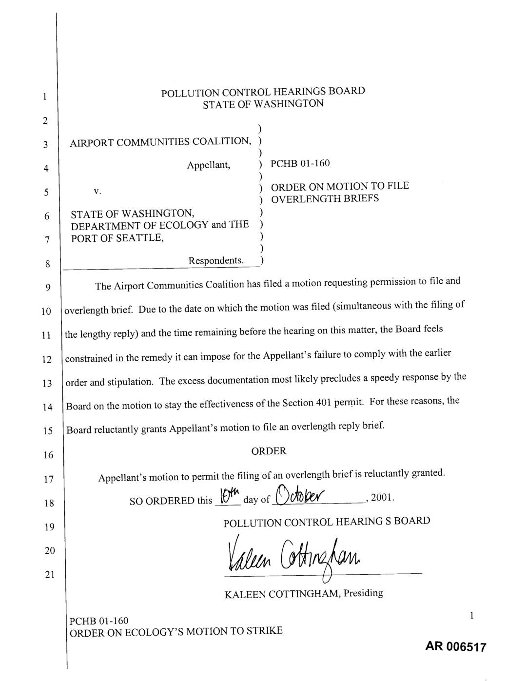 v. ) ORDER ON MOTION TO FILE ) OVERLENGTH BRIEFS STATE OF WASHINGTON, ) DEPARTMENT OF ECOLOGY and THE ) PORT OF SEATTLE, ) ) Respondents. ) The Airport Communities Coalition has filed a motion requesting permission to file and overlength brief. Due to the date on which the motion was filed (simultaneous with the filing of the lengthy reply) and the time remaining before the heating on this matter, the Board feels constrained in the remedy it can impose for the Appellant's failure to comply with the earlier order and stipulation. The excess documentation most likely precludes a speedy response by the Board on the motion to stay the effectiveness of the Section 401 permit. For these reasons, the Board reluctantly grants Appellant's motion to file an overlength reply brief. ORDER Appellant's motion to permit the filing of an overlength brief is reluctantly granted. SO ORDERED this ""[_ day of _)0_¢" ,2001. POLLUTION CONTROL HEARING S BOARD KALEEN COTTINGHAM, Presiding PCHB 01-160 1 ORDER ON ECOLOGY'S MOTION TO STRIKE AR 006517 -