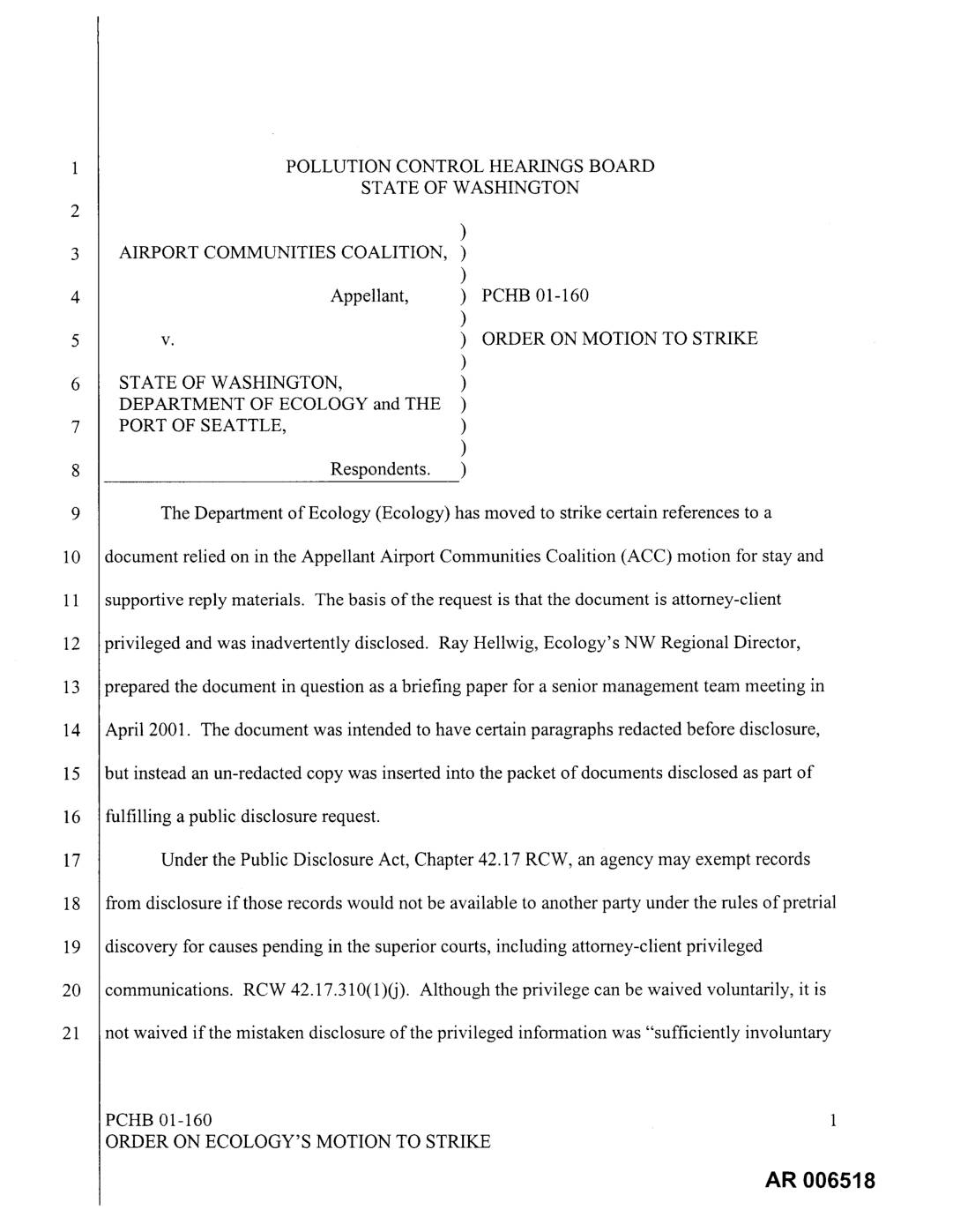 v. ) ORDER ON MOTION TO STRIKE ) STATE OF WASHINGTON, ) DEPARTMENT OF ECOLOGY and THE ) PORT OF SEATTLE, ) ) Respondents. ) The Department of Ecology (Ecology) has moved to strike certain references to a document relied on in the Appellant Airport Communities Coalition (ACC) motion for stay and supportive reply materials. The basis of the request is that the document is attorney-client privileged and was inadvertently disclosed. Ray Hellwig, Ecology's NW Regional Director, prepared the document in question as a briefing paper for a senior management team meeting in April 2001. The document was intended to have certain paragraphs redacted before disclosure, but instead an un-redacted copy was inserted into the packet of documents disclosed as part of fulfilling a public disclosure request. Under the Public Disclosure Act, Chapter 42.17 RCW, an agency may exempt records from disclosure if those records would not be available to another party under the rules of pretrial discovery for causes pending in the superior courts, including attorney-client privileged communications. RCW 42.17.310(1)(j). Although the privilege can be waived voluntarily, it is not waived if the mistaken disclosure of the privileged information was "sufficiently involuntary PCHB 01-160 1 ORDER ON ECOLOGY'S MOTION TO STRIKE AN 006518 and inadvertent as to be inconsistent with a theory of waiver." United States v. Zolin, 809 F.2d 1141, 1415, 1417 (9th Cir. 1987). Although the Washington Courts have not addressed the question of whether the attomey-client privilege is waived by an inadvertent disclosure of the privileged… -