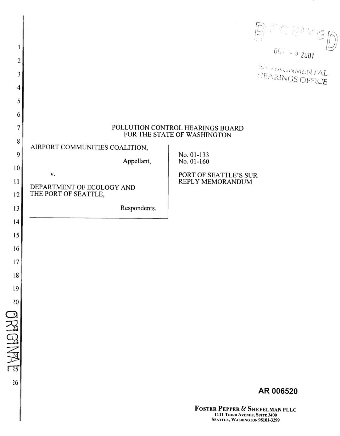 that the Board may consider of Port of Seattle's Motion to Strike Overlength Brief prior to the October 15, 2001 hearing on appellant's motion for stay. Ordinarily, motions before the Pollution Control Hearings Board must be filed ten days prior to consideration by the Board. On October 8, 2001, appellant Airport Communities Coalition filed an overlength response memorandum in direct violation of the Board's prior orders, and the parties' agreement, in this matter. The Port has moved to strike the overlength portions of ACC's reply memorandum. If the motion to strike were heard on the Board's regular schedule, the board will not reach the merits of the motion to strike until after the hearing has already taken place. Therefore, the Port of Seattle respectfully requests that the Board shorten time in which to hear the accompanying Port of Seattle's Motion to Strike Overlength Brief. AR 006525 ORIGINAL MOTION TO SHORTEN TIME - 1 FOSTER PEPPER _d SHEFELMAN PLLC 1111 TrilaO AVENUE, SUITE3400 SEATTLE, WASHINGTON 98101-3299 206-447-4400 5028151001 Respectfully submitted this 1sT day of October 2001. PORT OF SEATTLE __,_ ___,9_, _ 1Linda J._trout, General Counse, WSBA No. 9422 Traci M. Goodwin, Senior Port Counsel, WSBA No. 14974 FOSTER PEPPER & SHEFELMAN PLLC Roger A."-Pearce, WSBA No. 21113 Steven G. Jones, WSBA No. 19334 MARTEN & BROWN LLP JayJ. Mhflning, WSBA No. 13579 Gillis E. Reavis, WSBA No. 21451 AR 006526 MOTION TO SHORTEN TIME - 2 FOSTER PEPPER _.d SHEFELMAN PLLC 1111 THIRD AVENUE, SUITE 3400 SEATTLE, WASHINGTON 98101-3299 206-447-4400… -