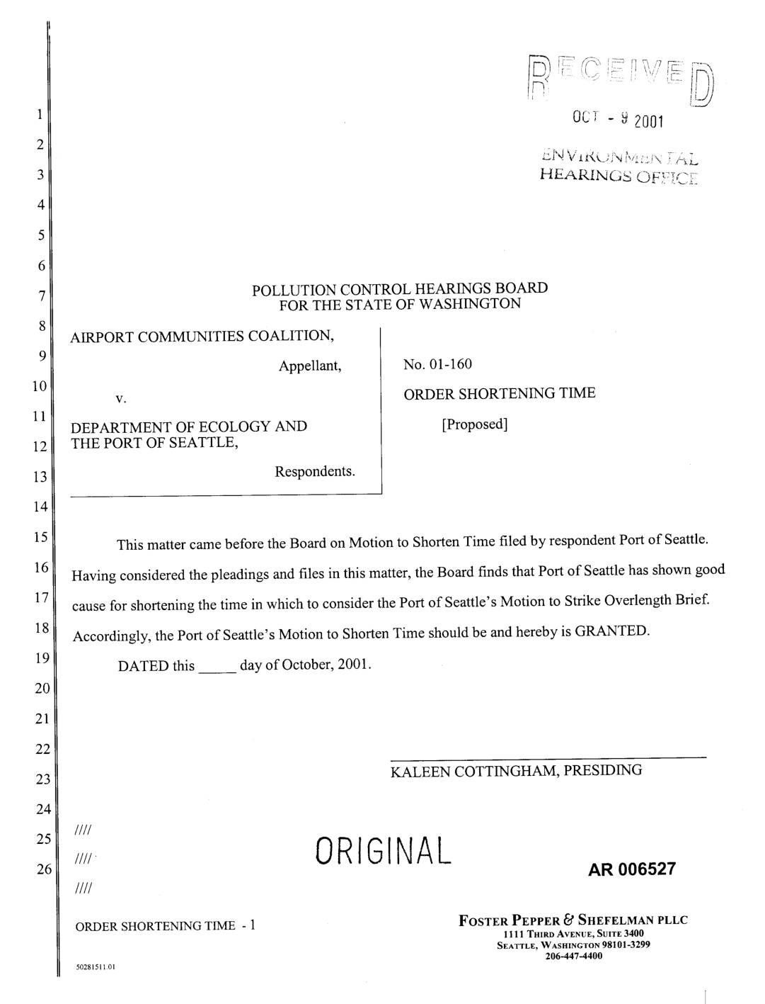Having considered the pleadings and files in this matter, the Board finds that Port of Seattle has shown good cause for shortening the time in which to consider the Port of Seattle's Motion to Strike Overlength Brief. Accordingly, the Port of Seattle's Motion to Shorten Time should be and hereby is GRANTED. DATED this __ day of October, 2001. KALEEN COTTINGHAM, PRESIDING //// HH ORIGINAL AR 006527 IIII ORDER SHORTENING TIME - 1 FOSTER PEPPER _d SHEFELMANPLLC 1111 THIRDAVENUE, SUITE3400 SEATTLE, WASHINGTON 98101-3299 5o28i511.ol 206-447-4400 Presented by: PORT OF SEATTLE Linda J._gtrout, General Counsel, WSBA No. 9422 Traci M. Goodwin, Senior Port Counsel, WSBA No. 14974 FOSTER PEPPER & SHEFELMAN PLLC Roger N,)Pearce,'WSBA No. 21113 Steven (3. Jones, WSBA No. 19334 MARTEN & BROWN LLP j._Ma_ing__ _IJay 13579 Gillis E. Reavis, WSBA No. 21451 ; AN 006528 ORDER SHORTENING TIME - 2 FOSTER PEPPER _._ SHEFELMAN PLLC 1111 THIRD AVENUE, SU1TE3400 SEATTLE, WASHINGTON98101-3299 206-447-4400 502815lL01 PCHB240006527 PCHB240006528 -