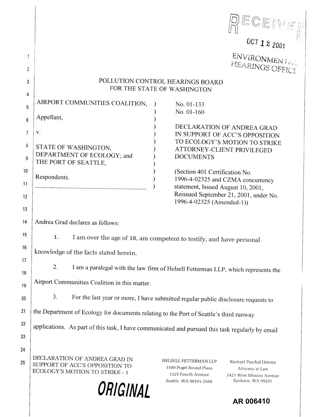 v. ) 1N SUPPORT OF ACC'S OPPOSITION ) TO ECOLOGY'S MOTION TO STRIKE STATE OF WASHINGTON, ) ATTORNEY-CLIENT PRIVILEGED DEPARTMENT OF ECOLOGY; and ) DOCUMENTS9 THE PORT OF SEATTLE, ) lo ) (Section 401 Certification No. Respondents. ) 1996-4-02325 and CZMA concurrency ) statement, Issued August 10, 2001, Reissued September 21, 2001, under No. 1996-4-02325 (Amended- 1)) Andrea Grad declares as follows: 1. I am over the age of 18, am competent to testify, and have personal knowledge of the facts stated herein. 2. I am a paralegal with the law firm of Helsell Fetterman LLP, which represents the Airport Communities Coalition in this matter.19 3. For the last year or more, I have submitted regular public disclosure requests to the Department of Ecology for documents relating to the Port of Seattle's third runway applications. As part of this task, I have communicated and pursued this task regularly by email DECLARATION OF ANDREA GRAD IN HELSELL FETTERMAN LLP Rachael Paschal Osborn SUPPORT OF ACC'S OPPOSITION TO 1500PugetSoundPlaza Attorneyat Law ECOLOGY'S MOTION TO STRIKE - 1 1325 Fourth Avenue 2421 West Mission Avenue Seattle, WA 98101-2509 Spokane, WA 99201 ORIGINAL ooo.,o with Ann Kenny and Sally Perkins of Ecology's Northwest Regional Office, per Ecology instructions as to how to submit requests. 4. Over the past year or more, on several occasions, responses to our requests indicated that documents had been withheld on various bases. Some of those documents were fi produced partially in redacted form, while others were withheld in their…