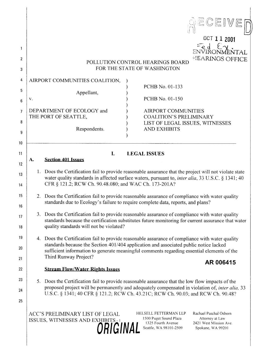 1. Does the Certification fail to provide reasonable assurance that the project will not violate state13 water quality standards in affected surface waters, pursuant to, inter alia, 33 U.S.C. § 1341; 40 CFR § 121.2; RCW Ch. 90.48.080; and WAC Ch. 173-201A? 2. Does the Certification fail to provide reasonable assurance of compliance with water quality standards due to Ecology's failure to require complete data, reports, and plans?16 3. Does the Certification fail to provide reasonable assurance of compliance with water quality standards because the certification substitutes future monitoring for current assurance that water Ia quality standards will not be violated? 4. Does the Certification fail to provide reasonable assurance of compliance with water quality standards because the Section 401/404 application and associated public notice lacked20 sufficient information to generate meaningful comments regarding essential elements of the Third Runway Proj ect? AR 006415 Stream Flow/Water Riphts Issues 5. Does the Certification fail to provide reasonable assurance that the low flow impacts of the proposed project will be permanently and adequately compensated in violation of, inter alia, 33 U.S.C. § 1341; 40 CFR § 121.2; RCW Ch. 43.21C; RCW Ch. 90.03; and RCW Ch. 90.48? ACC'S PRELIMINARY LIST OF LEGAL HELSELL FETTERMAN LLP Rachael Paschal Osborn ._-_IR_IIF_, WITNESSES AND EXHIBITS- 1 15o0PugetSound Plaza AttorneyatLaw1325Fourth Avenue 2421 West Mission Ave. ORIGINAL Seattle, WA 98101-2509 Spokane, WA 99201 6. Does the Certification fail to provide reasonable assurance that flow impacts will be appropriately mitigated because the low flow analysis (to date) rests on… -