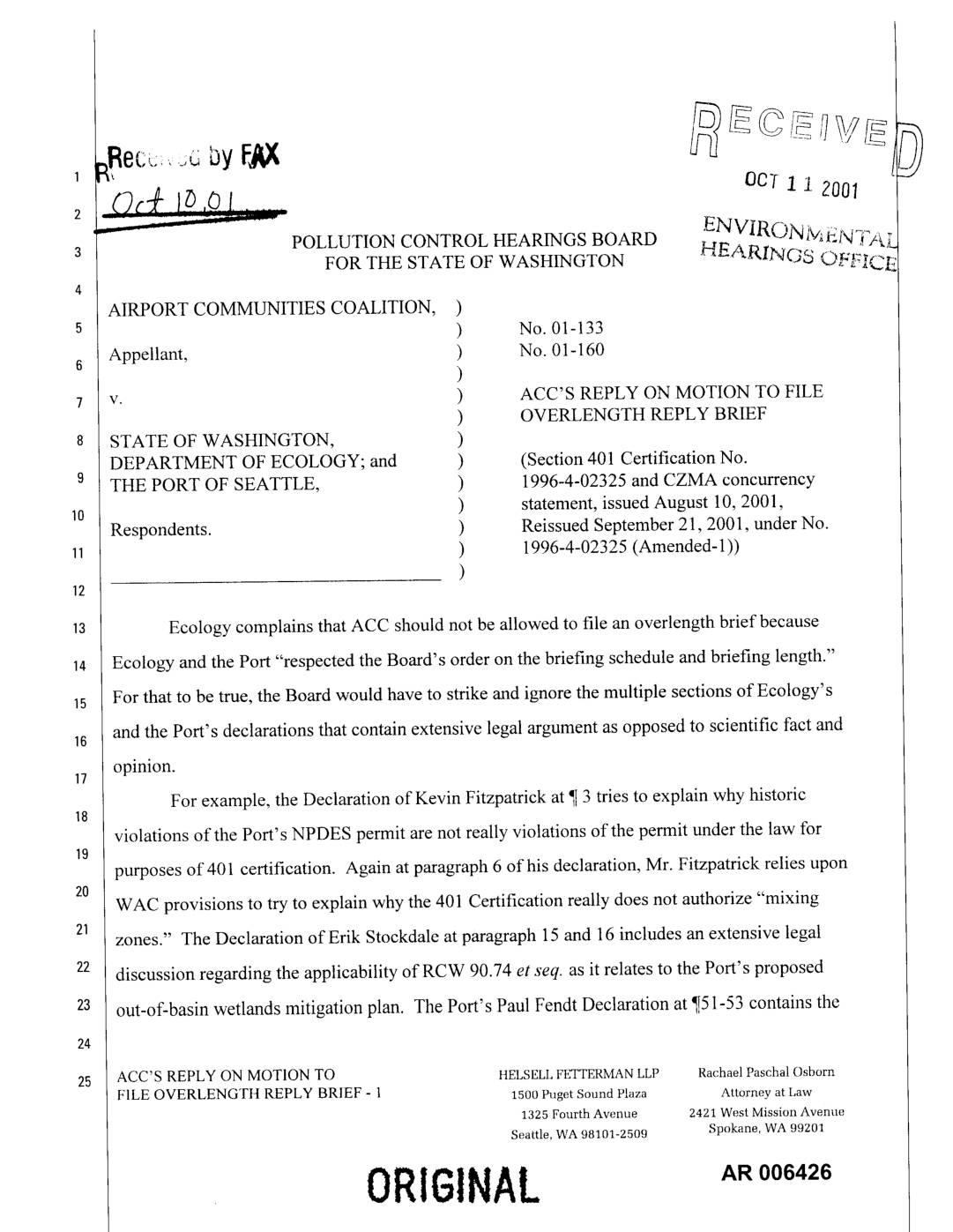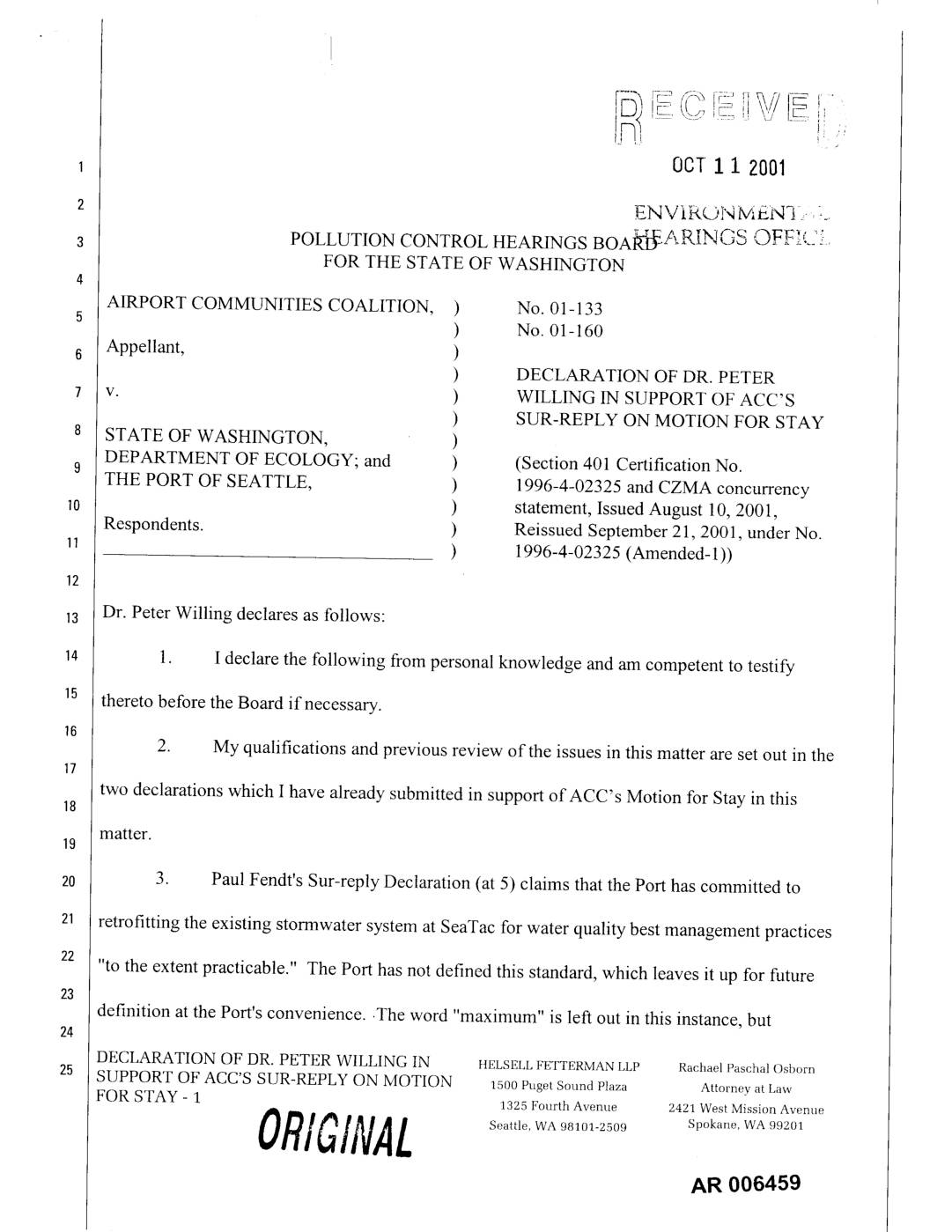 v. ) WILLING IN SUPPORT OF ACC'S ) SUR-REPLY ON MOTION FOR STAY STATE OF WASHINGTON, ) DEPARTMENT OF ECOLOGY; and ) (Section 401 Certification No.9 THE PORT OF SEATTLE, ) 1996-4-02325 and CZMA concurrency ) statement, Issued August 10, 2001, Respondents. ) Reissued September 21,2001, under No. ) 1996-4-02325 (Amended-I)) Dr. Peter Willing declares as follows: 1. I declare the following from personal knowledge and am competent to testify thereto before the Board if necessary. 2. My qualifications and previous review of the issues in this matter are set out in the two declarations which I have already submitted in support of ACC's Motion for Stay in this matter. 3. Paul Fendt's Sur-reply Declaration (at 5) claims that the Port has committed to retrofitting the existing stormwater system at SeaTac for water quality best management practices "to the extent practicable." The Port has not defined this standard, which leaves it up for future definition at the Port's convenience..The word "maximum" is left out in this instance, but DECLARATION OF DR. PETER WILLING IN HELSELL FETTERMAN LLP RachaelPaschalOsborn SUPPORT OF ACC'S SUR-REPLY ON MOTION 1500pugetSound Plaza Attorneyat Law FOR STAY - 1 1325 Fourth Avenue 2421 West Mission Avenue ORIGINAL Seattle, WA 98101-2509 Spokane, WA 99201 AN 006459 1_-_9-2e) 1 9:13AM FROM WATER RESOURCES CONS 368676184@ P. 2 10-1_-Z091 1O:O0_ Fr_-_L_LL FETI_.+.J/ ZSZ4T'-15| P.OO3/OH F-OZS included ctsewher_ (Comprehensive Smn'nwater Planpp. 7-9, included as FendtExhibit'B). z "Exten: pracdcab£e"is not mc same rhmg as AKART, nor doe, it go beyond the bare… -