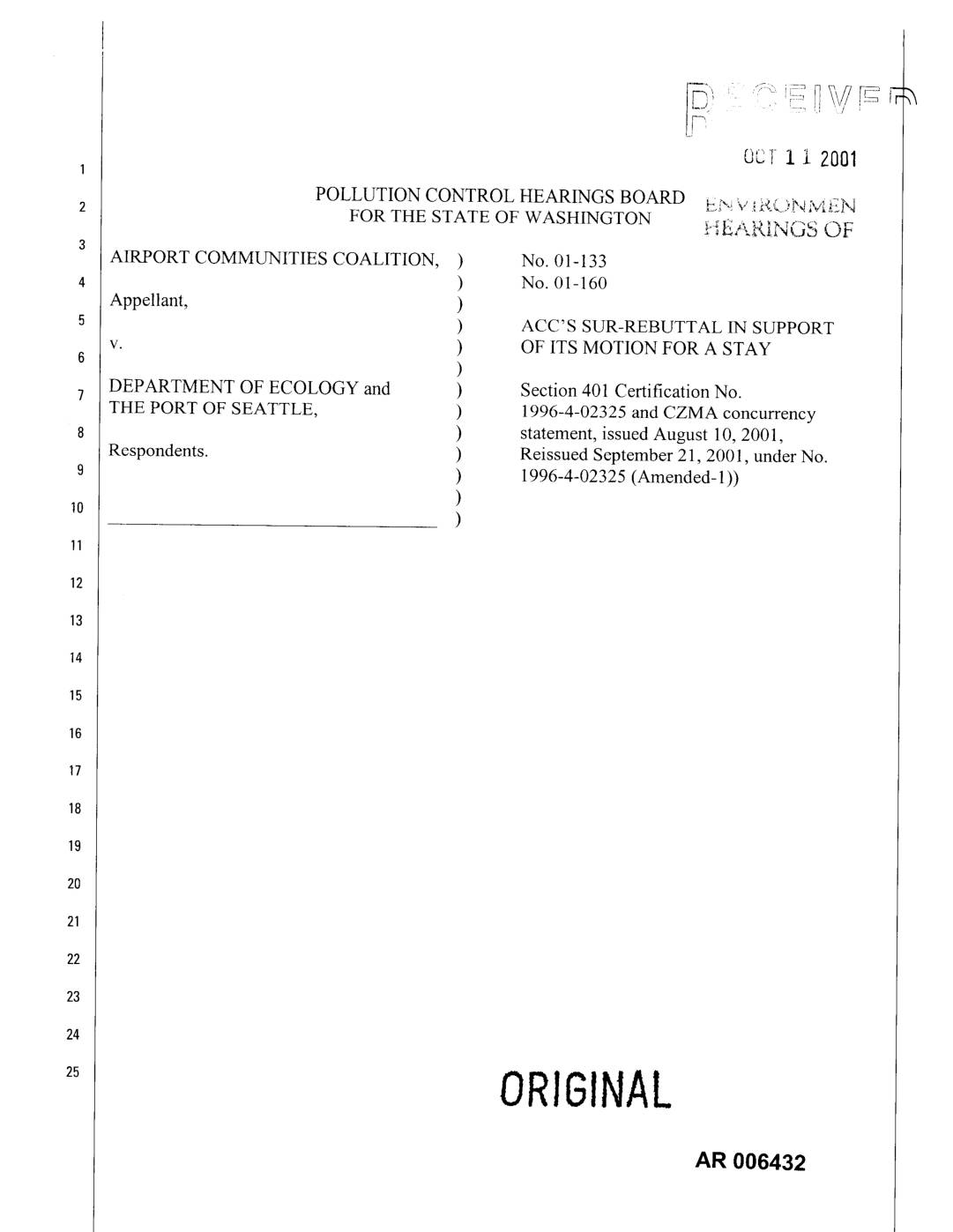 v. ) OF ITS MOTION FOR A STAY ) DEPARTMENT OF ECOLOGY and ) Section 401 Certification No.7 THE PORT OF SEATTLE, ) 1996-4-02325 and CZMA concurrency ) statement, issued August 10, 2001, Respondents. ) Reissued September 21, 2001, under No. ) 1996-4-02325 (Amended- 1)) ) ) -
