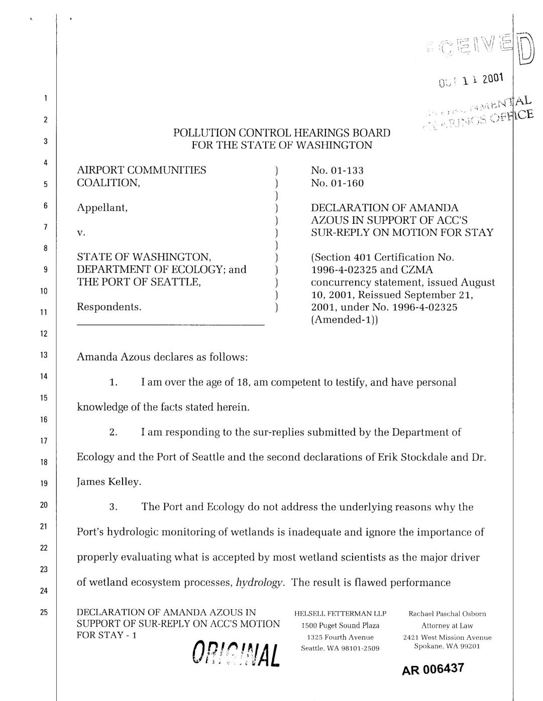 v. ) SUR-REPLY ON MOTION FOR STAY ) STATE OF WASHINGTON, ) (Section 401 Certification No. DEPARTMENT OF ECOLOGY; and ) 1996-4-02325 and CZMA THE PORT OF SEATTLE, ) concurrency statement, issued August ) 10, 2001, Reissued September 21, Respondents. ) 2001, under No. 1996-4-02325 (Amended-i)) Amanda Azous declares as follows: 1. I am over the age of 18, am competent to testify, and have personal knowledge of the facts stated herein. 2. I am responding to the sur-replies submitted by the Department of17 Ecology and the Port of Seattle and the second declarations of Erik Stockdale and Dr. James Kelley. 3. The Port and Ecology do not address the underlying reasons why the Port's hydrologic monitoring of wetlands is inadequate and ignore the importance of properly evaluating what is accepted by most wetland scientists as the major driver of wetland ecosystem processes, hydrology. The result is flawed performance24 DECLARATION OF AMANDA AZOUS IN HELSELL FETTERMAN LLP Rachael Paschal Osborn SUPPORT OF SUR-REPLYON ACC'S MOTION 1500PugetSoundPlaza Attorneyat Law FOR STAY - 1 1325 Fourth Avenue 2421 West Mission Avenue O_2#_#_JAL.,. _ , Seattle, WA98101-2509 Spokane, WA99201 AR 006437 standards for ensuring adequate seepage flows to remaining wetlands that will result in reduced functioning of remaining wetland areas. 4. Two wetlands, 18 and 37, are in immediate danger of irrevocable alteration from filling of their tributary wetlands and streams due to the Port's near4 term fill plans. Wetlands to be filled in the near term include part of Wetland 18, and… -