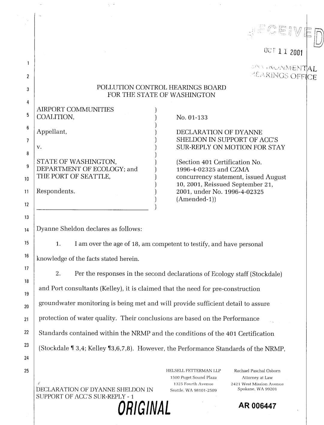 v. ) SUR-REPLY ON MOTION FOR STAY ) STATE OF WASHINGTON, ) (Section 401 Certification No. DEPARTMENT OF ECOLOGY; and ) 1996-4-02325 and CZMA THE PORT OF SEATTLE, ) concurrency statement, issued August ) 10, 2001, Reissued September 21, Respondents. ) 2001, under No. 1996-4-02325 ) (Amended-i)) ) Dyanne Sheldon declares as follows: 1. I am over the age of 18, am competent to testify, and have personal knowledge of the facts stated herein. 2. Per the responses in the second declarations of Ecology staff (Stockdale) and Port consultants (Kelley), it is claimed that the need for pre-construction19 groundwater monitoring is being met and will provide sufficient detail to assure protection of water quality. Their conclusions are based on the Performance Standards contained within the NRMP and the conditions of the 401 Certification (Stockdale ¶ 3,4; Kelley ¶3,6,7,8). However, the Performance Standards of the NRMP, HELSELL FETTERMAN LLP Rachael Paschal Osborn 1500 Puget Sound Plaza Attorney at Law ,_ 1325 Fourth Avenue 2421 West Mission Avenue DECLARATION OF DYANNE SHELDON IN Seattle. WA 98101-2509 Spokane, WA 99201 SUPPORT OF ACC'S SUR-REPLY - 1 ORIGINAL ,. 006447 as summarized by Kelley (¶10) provide virtually no quantifiable standard by which to measure whether groundwater parameters have been met. The Performance standard states, "Wetland areas with organic soils...will have soils saturated in the upper part (emphasis added) to mid-June in years of normal (emphasis added, see ¶ 3, below) rainfall." For the wetlands that have mineral soils, the Performance standard is6 stated as,… -