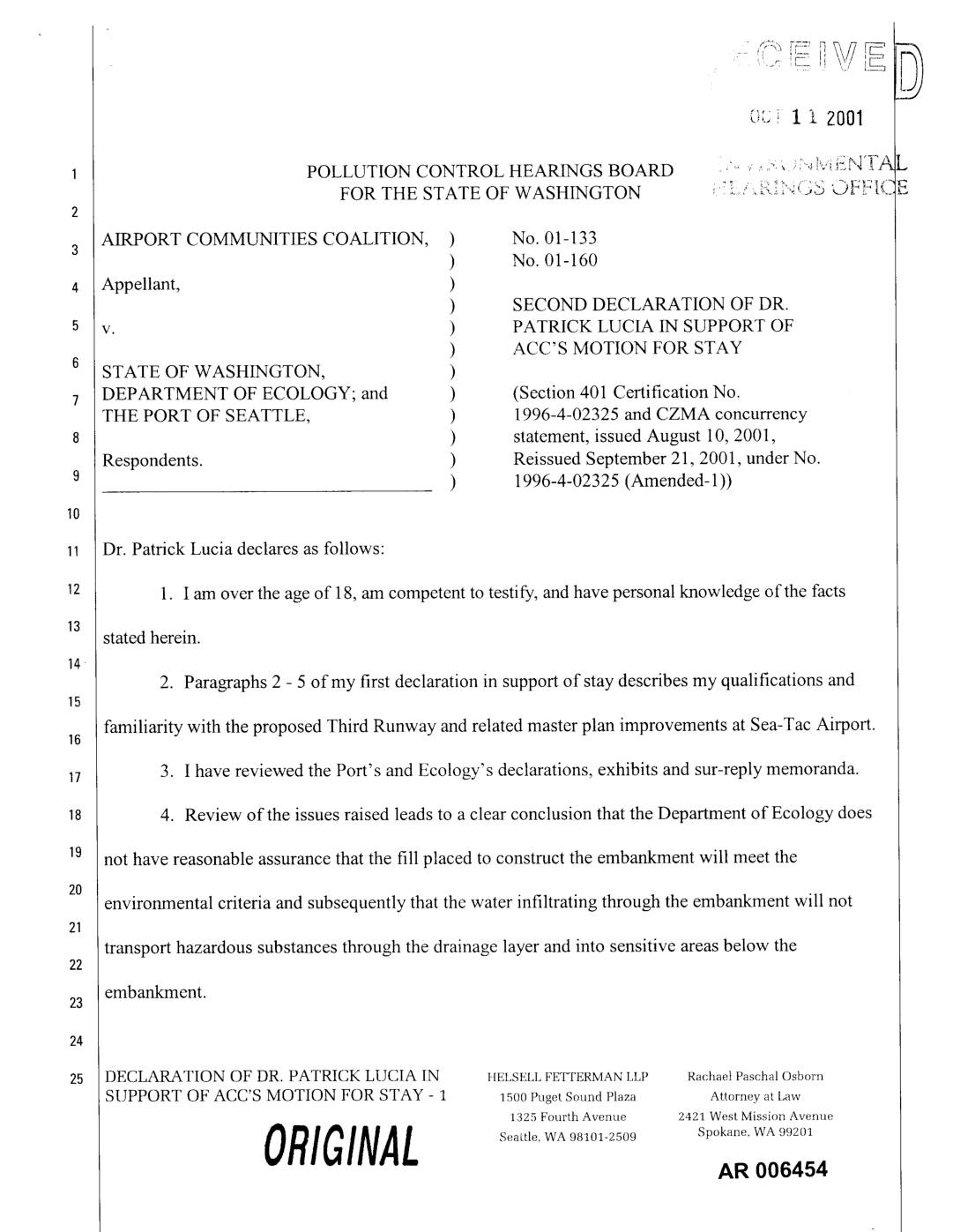 v. ) PATRICK LUCIA IN SUPPORT OF ) ACC'S MOTION FOR STAY STATE OF WASHINGTON, ) DEPARTMENT OF ECOLOGY; and ) (Section 401 Certification No. THE PORT OF SEATTLE, ) 1996-4-02325 and CZMA concurrency ) statement, issued August 10, 2001, Respondents. ) Reissued September 21, 2001, under No. ) 1996-4-02325 (Amended- 1)) Dr. Patrick Lucia declares as follows: 1. I am over the age of 18, am competent to testify, and have personal knowledge of the facts stated herein. 2. Paragraphs 2 - 5 of my first declaration in support of stay describes my qualifications and familiarity with the proposed Third Runway and related master plan improvements at Sea-Tac Airport. 3. I have reviewed the Port's and Ecology's declarations, exhibits and sur-reply memoranda. 4. Review of the issues raised leads to a clear conclusion that the Department of Ecology does not have reasonable assurance that the fill placed to construct the embankment will meet the environmental criteria and subsequently that the water infiltrating through the embankment will not transport hazardous substances through the drainage layer and into sensitive areas below the embankment. DECLARATION OF DR. PATRICK LUCIA IN HELSELL FETTERMAN LLP RachaelPaschalOsborn SUPPORT OF ACC'S MOTION FOR STAY - 1 15o0PugetSoundPlaza Attorneyat Law 1325 Fourth Avenue 2421 West Mission Avenue ORIGINAL Seattle, WA 98101-2509 Spokane, WA 99201 AR 006454 5. The second declaration of C. Lin Gould states that the MTCA method A cleanup level for arsenic (20 milligrams per kilogram) "represents 'natural background' as described in WAC 173-340- 900… -
