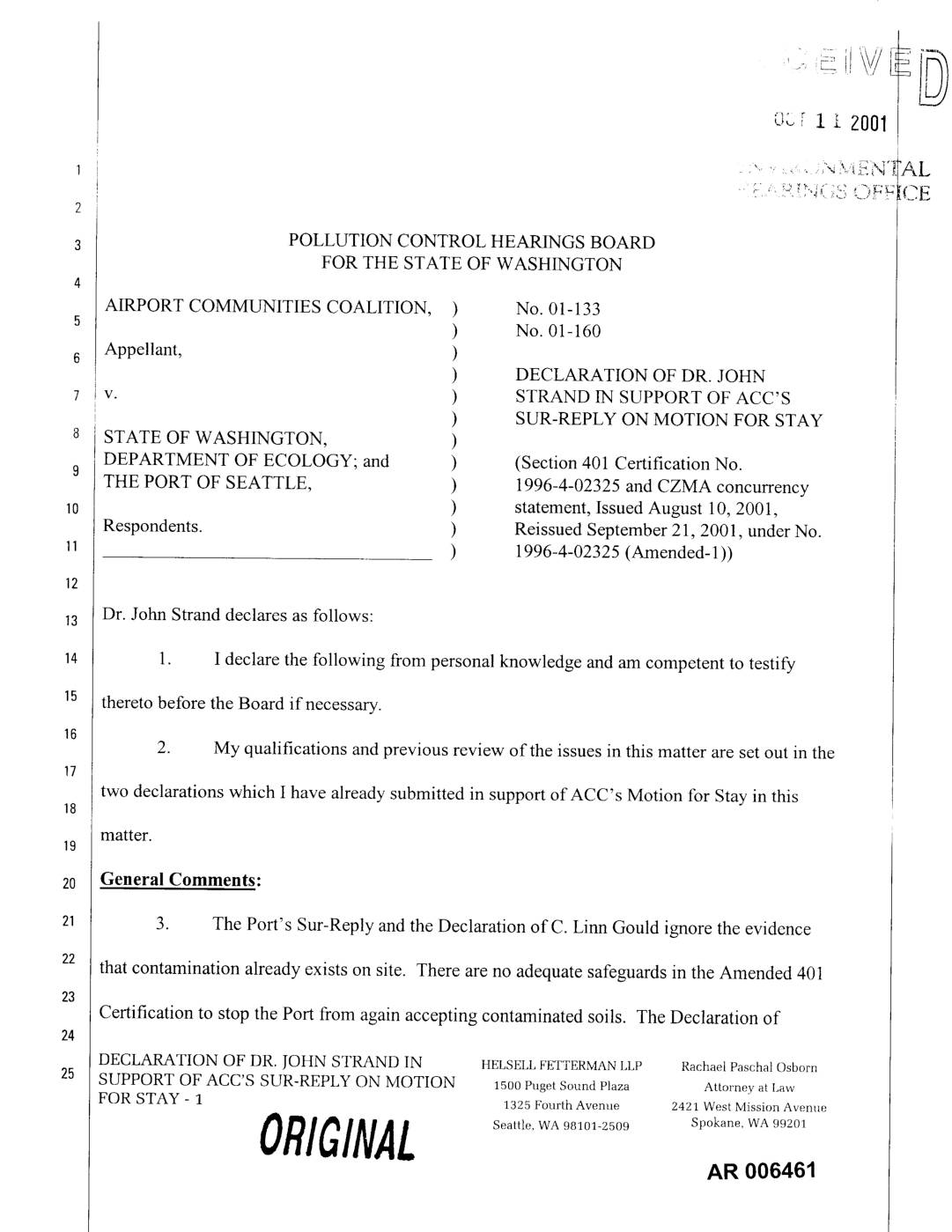 v. ) STRAND IN SUPPORT OF ACC'S ) SUR-REPLY ON MOTION FOR STAY STATE OF WASHINGTON, ) DEPARTMENT OF ECOLOGY; and ) (Section 401 Certification No.9 THE PORT OF SEATTLE, ) 1996-4-02325 and CZMA concurrency ) statement, Issued August 10, 2001, Respondents. ) Reissued September 21,2001, under No. ) 1996-4-02325 (Amended- 1)) Dr. John Strand declares as follows: 1. I declare the following from personal knowledge and am competent to testify thereto before the Board if necessary. 2. My qualifications and previous review of the issues in this matter are set out in the two declarations which I have already submitted in support of ACC's Motion for Stay in this matter. GeneralComments: 3. The Port's Sur-Reply and the Declaration ofC. Linn Gould ignore the evidence that contamination already exists on site. There are no adequate safeguards in the Amended 401 Certification to stop the Port from again accepting contaminated soils. The Declaration of DECLARATION OF DR. JOHN STRAND IN HELSELL FETTERMAN LLP RachaelPaschalOsborn SUPPORT OF ACC'S SUR-REPLY ON MOTION 150oPugetSoundPlaza Attorneyat Law FOR STAY - 1 1325 Fourth Avenue 2421 West Mission Avenue ORIGINAL Seattle, WA 98101-2509 Spokane, WA 99201 AN 006461 Elizabeth Clark submitted with the Port's response materials also unjustifiably downplays the contamination in soils the Port has already accepted, e.g., from the Hamm Creek and First Avenue Bridge sites. See First Strand Decl. at ¶¶ 6, 31 ; Second Strand Decl. at ¶¶ 23-25, 28; Ms. Clark does not even begin to address the point we make… -