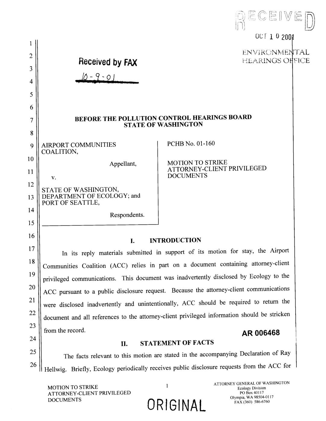 In its reply materials submitted in support of its motion for stay, the Airport Communities Coalition (ACC) relies in part on a document containing attorney-client privileged communications. This document was inadvertently disclosed by Ecology to the ACC pursuant to a public disclosure request. Because the attorney-client communications were disclosed inadvertently and unintentionally, ACC should be required to return the document and all references to the attorney-client privileged information should be stricken from the record. AR 006468 II. STATEMENT OF FACTS The facts relevant to this motion are stated in the accompanying Declaration of Ray Hellwig. Briefly, Ecology periodically receives public disclosure requests from the ACC for MOTION TO STRIKE 1 ATTORNEYGENERALOFWASHINGTON Ecology Division ATTORNEY-CLIENT PRIVILEGED eo Box 401 | 7 0RIGINAL documents relating to the Sea-Tac International Airport (STIA) expansion project. Ecology's practice is to review documents responsive to the ACC's requests for non-disclosable material and withhold such material from disclosure. Dec. of Hellwig, ¶ 3. Particularly, Ecology does not disclose attorney-client privileged information. Id In the present case, Ecology inadvertently disclosed a document containing attorney- client privileged communications to the ACC. Ecology intended to redact the attorney-client privileged information from the document prior to disclosure. Dec. ofHellwig ¶ 4. Ecology's attorneys did in fact redact the information from one copy of the document but Ecology inadvertently disclosed another copy of the document without the information redacted. Dec. of Hellwig, ¶ 5. Because the attorney-client privileged information was inadvertently disclosed, it should be stricken from the record and ACC should… -