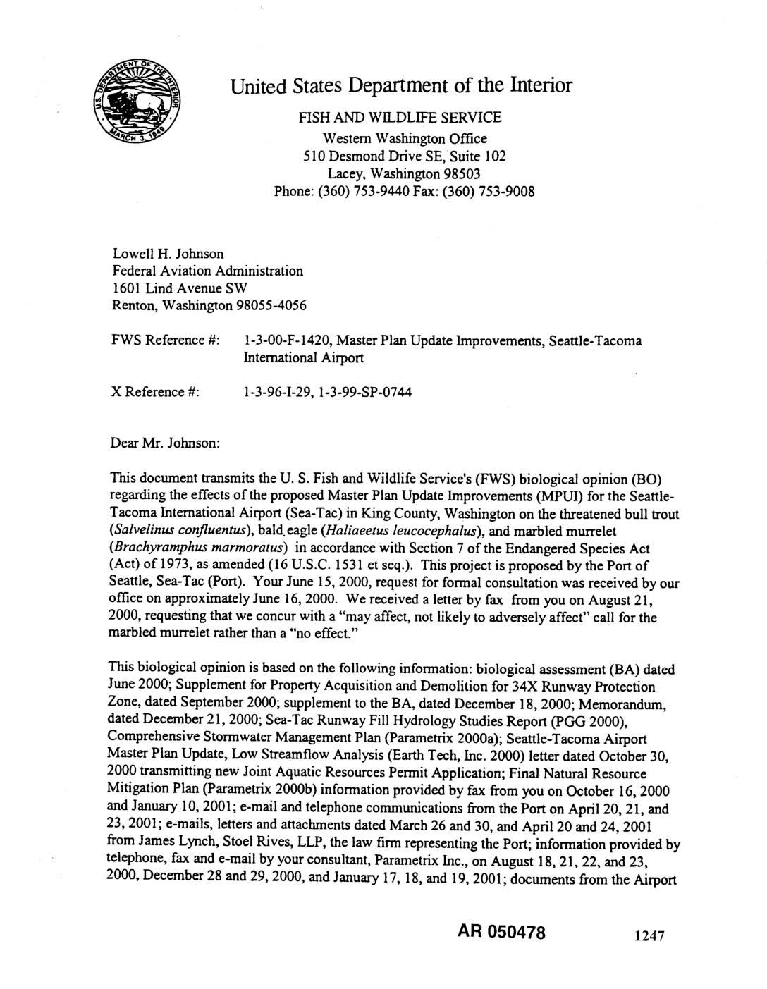 FWS Reference #: 1-3-00-F-1420, Master Plan Update Improvements, Seattle-Tacoma International Airport X Reference #: 1-3-96-1-29, 1-3-99-SP-0744 Dear Mr. Johnson: This document transmits the U. S. Fish and Wildlife Service's (FWS) biological opinion 030) regarding the effects of the proposed Master Plan Update Improvements (MPUI) for the Seattle- Tacoma International Airport (Sea-Tat) in King County, Washington on the threatened bull trout (Salvelinus confluentus), bald. eagle (Haliaeetus leucocephalus), and marbled murrelet (Brachyramphus marmoratus) in accordance with Section 7 of the Endangered Species Act (Act) of 1973, as amended (16 U.S.C. 1531 et seq.). This project is proposed by the Port of Seattle, Sea-Tac (Port). Your June 15, 2000, request for formal consultation was received by our office on approximately June 16, 2000. We received a letter by fax from you on August 21, 2000, requesting that we concur with a "may affect, not likely to adversely affect" call for the marbled murrelet rather than a "'no effect." This biological opinion is based on the following information: biological assessment (BA) dated June 2000; Supplement for Property Acquisition and Demolition for 34X Runway Protection Zone, dated September 2000; supplement to the BA, dated December 18, 2000; Memorandum, dated December 21, 2000; Sea-Tac Runway Fill Hydrology Studies Report (PGG 2000), Comprehensive Stormwater Management Plan (Parametrix 2000a); Seattle-Tacoma Airport Master Plan Update, Low Streamflow Analysis (Earth Teeh, Inc. 2000) letter dated October 30, 2000 transmitting new Joint Aquatic Resources Permit Application; Final Natural Resource Mitigation Plan (Parametrix 2000b) information provided by fax from you on October…