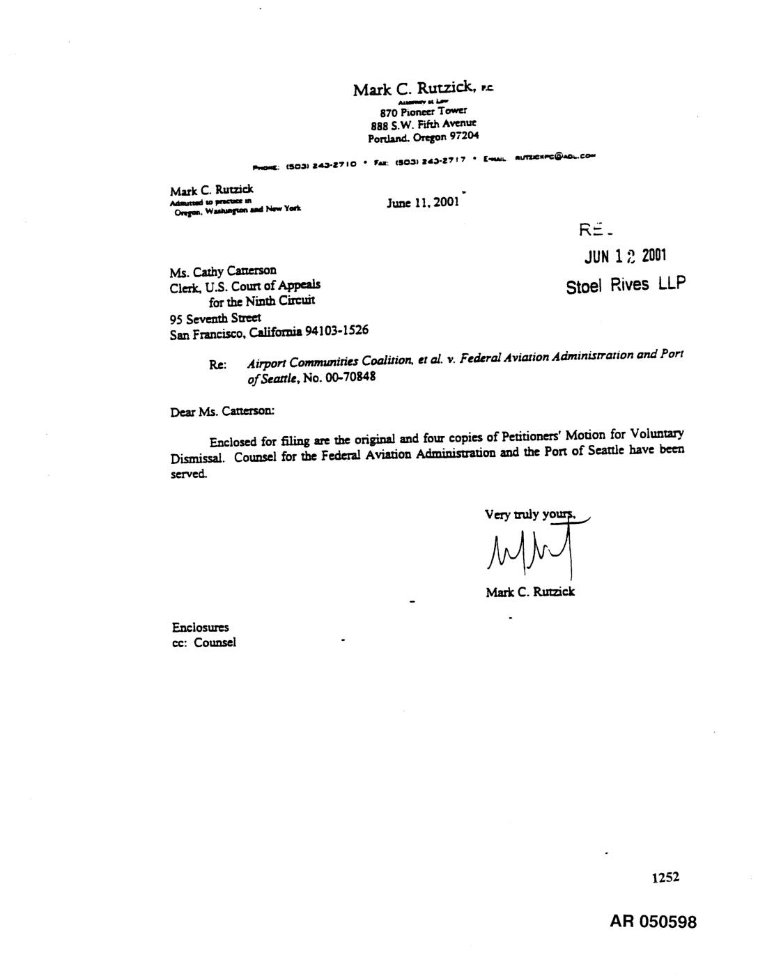 Enclosed for filing are the origi_ and four copies of Petitioners' Motion for Voluntary Dismissal. Counsel for the Fedend Avimon Admimstmtion and the Port of Seaule have been served, MarkC. Rut_ck Enclosures cc: Counsel 1252 AR 050598 RECE:VF . JUN1 2001i4 No.OO-os Stoel Rives LLF J _rA'rE_ COURT OF APPEALS FOR THE NINTH CIRCUIT AIRPORT COMMIYNIT_S COALITION, et al., Petitioners, FEDERAL AVIATION ADMINISTRATION ud PORT OF SEATTLE, Respondents. PETITION FOR REVIEW OF FEDERAL AVIATION ADMINISTRATION ORDER PETITIONERS' MOTION FOR VOLUNTARY DISMISSAL Petitioners Airport Communities Coalition (ACC), City of Des Moines, City of Normandy Park, City of Burien, City of'Federal Way, City of Tulcwila, and Highline School District No. 401 move for voluntary dismissal pursuant to Fed. 11.App. P. 42(b) on the gzound that petitioners have achieved substantially all the reliefth_ sought m _.is case through issuanc_ of a biological opinion by the U.S. Fish and Wildlife Service (FWS) in May 2001 addressing the effects of the ongoing implementation of the Master Plan Updat_ Development Actions (MPU) for Seattle-Ta=oma International Airport on threatened Coastal/Puget Sound bull trout and endangered marbled murrelets; and by the i._uan_ of a letter of concun'ence by the National Marine Fhharies Service (NMFS) on May 31, 2001 addressing the effects of the MPU on Puget Sound ehlnook salmon. Before ACC filed this case and the related pending action in the We_-a District of Washington, respondents Federal Aviation AdminLstmfion ('FAA) and Port of Seattle, Washington AR 050599 (Port of Seanle) had completely ignored their duties underthe Endangered Species… -
