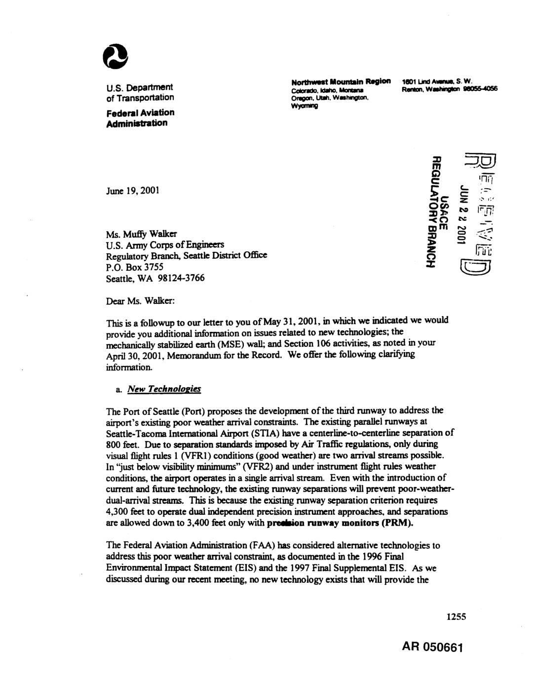 U.S. Army Corps of Engineers _,_ _ Regulatory Branch, Seattle District Office 0 Box 3755 _: C'_"_P.O. Seattle, WA 98124-3766 Dear Ms. Walker: This is a followup to our letter to you of May 31, 2001, in which we indicated we would provide you additional information on issues related to new technologies; the mechanically stabilized earth (MSE) wall; and Section ! 06 activities, as noted in your April 30, 2001, Memorandum for the Record. We offer the following clarifying informatiorL a. New Technologies The Port of Seattle (Port) proposes the development of the third runway to address the airport's existing poor weather arrival constraints. The existing parallel runways at Seattle-Tacoma International Airport (STIA) have a centerline-to-centerline separation of 800 feet. Due to separation standards imposed by Air Traffic regulations, only during visual flight rules 1 (VFR1) conditions (good weather) are two arrival streams possible. In "just below visibility minimums" (VFR2) and under instrument flight rules weather conditions, the airport operates in a single arrival stream. Even with the introduction of current and future technology, the existing runway separations will prevent poor-weather- dual-arrival streams. This is because the existing runway separation criterion requires 4,300 feet to operate dual independent precision instrument approaches, and separations are allowed down to 3,400 feet only with predmion runway monitors (PRM). The Federal Aviation Administration (FAA) has considered alternative technologies to address this poor weather arrival constraint, as documented in the 1996 Final Environmental Impact Statement O/IS) and the 1997 Final Supplemental EIS. As we discussed… -