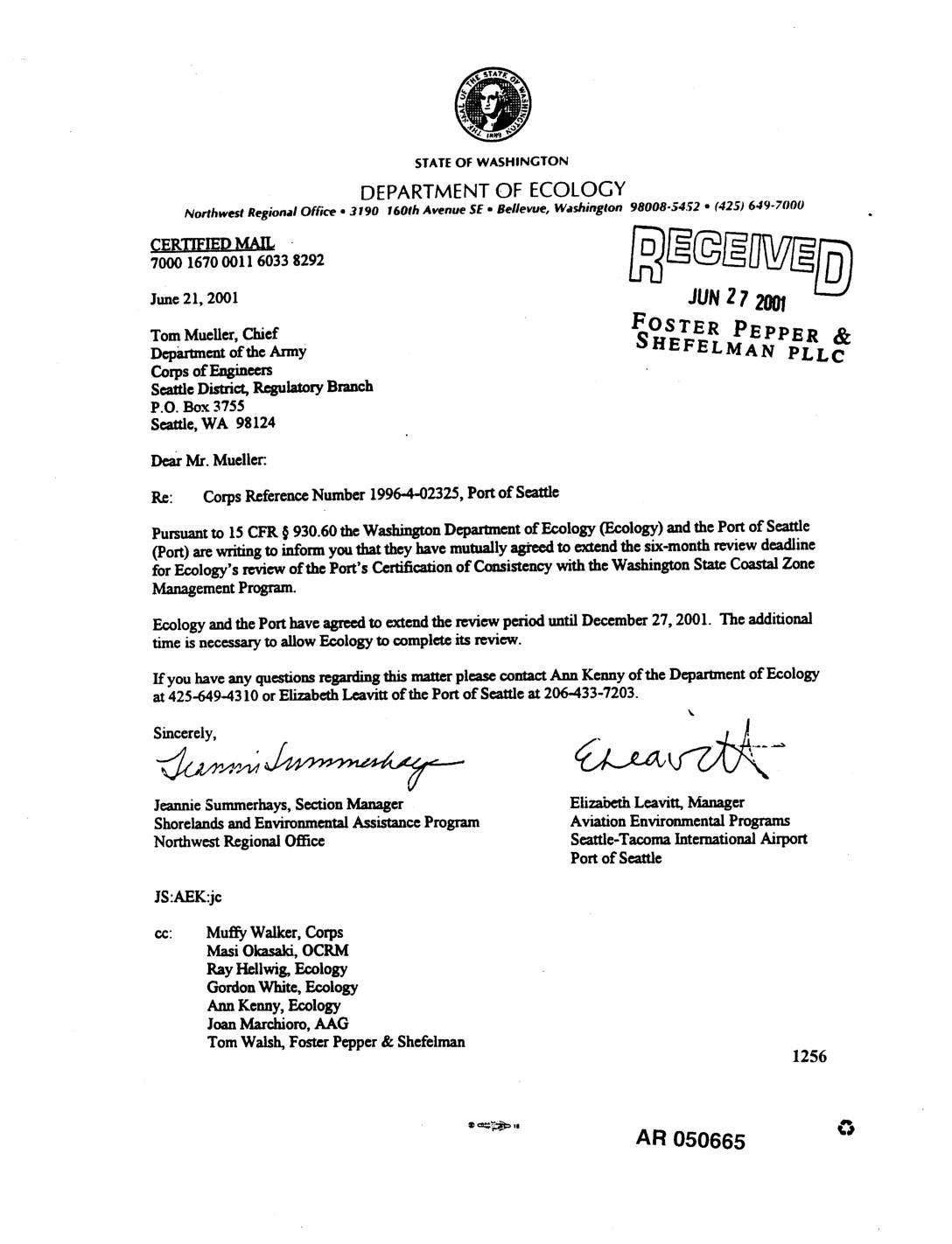Norlhwest Regional Office • 3190 1601h Avenue SE • Bellevue, Washington 98008.$4._2 • (42S) 649-7000 7000 1670 0011 6033 8292 Jne21,2001 JUNZ1 2001 TomMucller, Chief FOSTER PEPPER & DeparUnentofthe Army SHEFELMAN PLLc Corpsof F_ineers SeattleDistrict, Resulatory Branch P.O. Box 3755 Seattle,WA 98124 DearMr. Mueller. Re: CorpsReferenceNumber 1996-4-02325, Portof Seattle Pursuantto 15 CFR § 930.60 the WashingtonDepartmentof Ecology (Ecology) and the Portof Seattle (Port)arewritingto inform you thatthey have mum=flyagreed to extend the s/x-month review deadline forEcology's review of the Port's Certificationof Consistency withthe Washington State CoastalZone ManagementProgram. Ecology and the Porthaveagreedto extendthe rev/ew perioduntil December 27, 2001. The additional time is necessaryto allow Ecology to complete its review. If you haveany questionsregardingthis matterplease contactAnn Kenny of the Depamnent of Ecology at425-649-4310 orElizabethLcavitt of the Port of Seattle at 206-433-7203. JeannieSummerhays,SectionManager ElizabethLeavitt, Manager Shorelandsand EnvironmentalAssistance Program Aviation EnvironmentalPrograms NorthwestRegional Office Seattle-TacomaInternationalAirport Portof Seattle JS:AEK:jc co: Mufi_ Walker,Corps Masi Okasaki,OCRM Ray I-leUw/g,Ecology GordonWhite, Ecology Ann Kenny,Ecology JoanMm'_om, AAG Tom Walsh, FosterPepper& Shefelman 1256 ®_" AR 050665 EXH1256050665 -