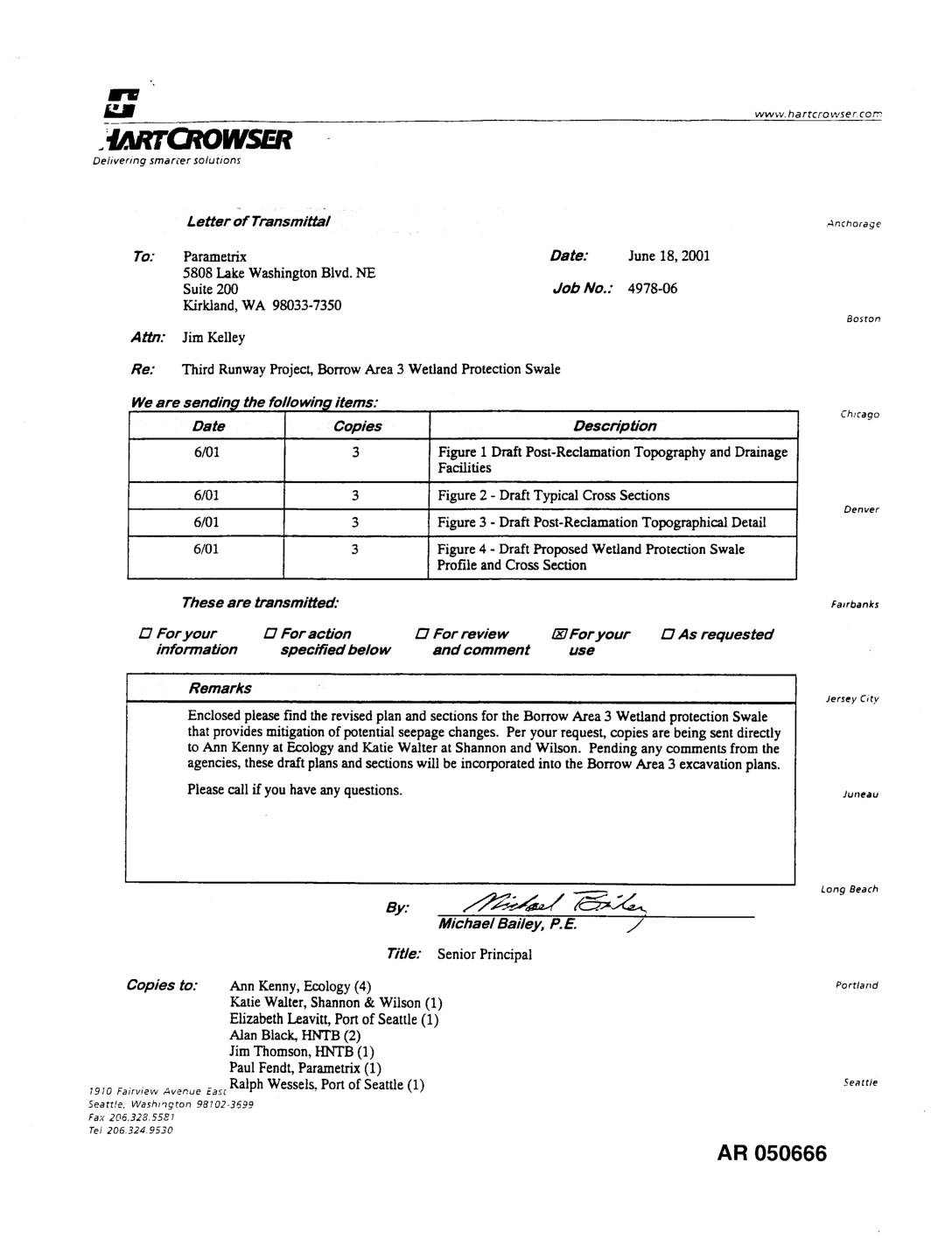 Re: Third Runway Project, Borrow Area 3 Wetland Protection Swale We are sendin_t the followin_l items: Chicago Date Copies Description 6/01 3 Figure 1 Draft Post-Reclamation Topography and Drainage Facilities 6/01 3 Figure 2 - Draft Typical Cross Sections Denver 6/01 3 Figure 3 - Draft Post-Reclamation Topographical Detail 6/01 3 Figure 4 - Draft Proposed Wetland Protection Swale Profile and Cross Section These are transmitted: Fasrbanks £2For your L2For action L2For review _T For your L2As requested information specified below and comment use Remarks Jersey City Enclosed please find the revised plan and sections for the Borrow Area 3 Wetland protection Swale that provides mitigation of potential seepage changes. Per your request, copies are being sent directly to Ann Kenny at Ecology and Katie Walter at Shannon and Wilson. Pending any comments from the agencies, these draft plans and sections will be incorporated into the Borrow Area 3 excavation plans. Please call if you have any questions. Ju,,eao By: ,on,8each Michael Bailey, P.E. j Title: Senior Principal Copies to: Ann Kenny, Ecology (4) Portla,,d Katie Walter, Shannon & Wilson (1) Elizabeth Leavitt, Port of Seattle (1) Alan Black, HNTB (2) Jim Thomson, HNTB (1) Paul Fendt, Parametrix (1) 1910FairviewAvenueEaseRalph Wessels, Port of Seattle (1) seatoe Seattle, Washington 98702-3699 Fax 206.328.5581 Tel 206.324.9530 AR 050666 °°° I_ o _°_. o 0 c_o_ __oc .._ m o_o.__ _'_'_ u _ EXH1257050666 EXH1257050667 EXH1257050668 EXH1257050669 EXH1257050670 -
