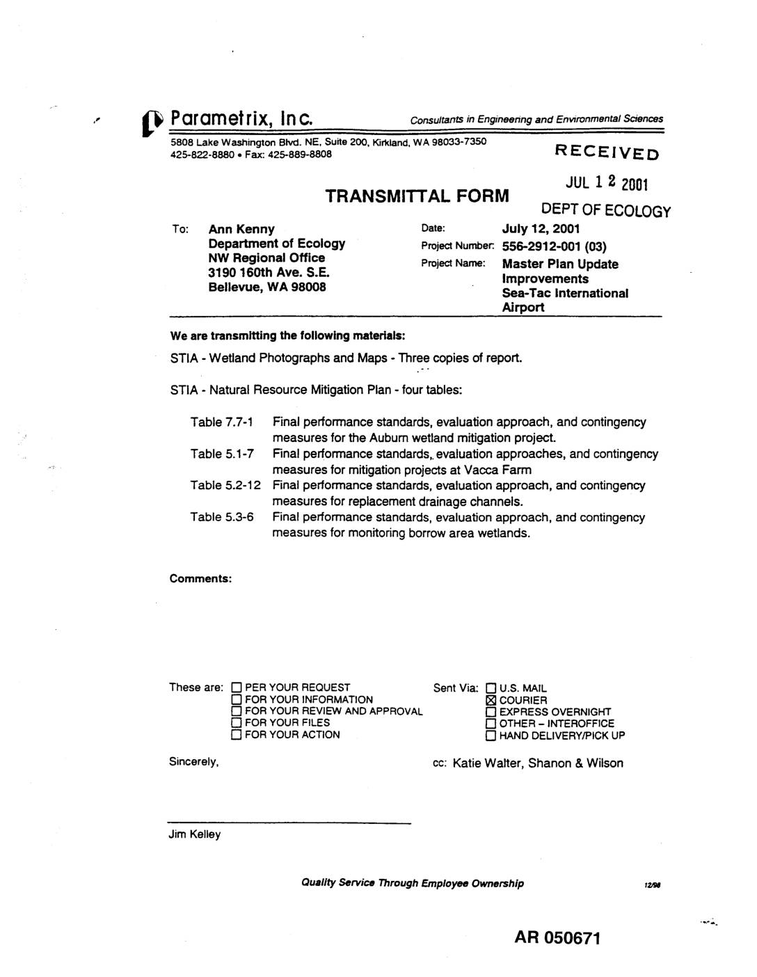 42S-B_-S_O•Fax:42s-889-88o8 R E C E IV E D JUL1 Z Z001 TRANSMITTAL FORM DEPTOFECOLOGY To: Ann Kenny Date: July 12, 2001 Department of Ecology ProjectNumber:.556-2912-001 (03) NW Regional Office ProjectName: Master Plan Update 3190 160th Ave. S.E. Improvements Bellevue, WA 98008 Sea-Tat International Airport We aretransmittingthe followingmaterials: STIA - Wetland PhotographsandMaps - Threecopiesof report. °. STIA - Natural Resource MitigationPlan- fourtables: Table 7.7-1 Finalperformancestandards,evaluationapproach,and contingency ' measuresfor the Auburnwetlandmitigationproject. Table 5.1-7 Final performancestandards,,evaluationapproaches, and contingency _ measuresfor mitigationprojectsat Vacca Farm Table 5.2-12 Finalperformancestandards,evaluationapproach,andcontingency measuresfor replacementdrainagechannels. Table 5.3-6 Final performancestandards,evaluationapproach,and contingency measuresfor monitoringborrowarea wetlands. Comments: These are: [-I PER YOUR REQUEST Sent Via: I'1U.S. MAIL [] FOR YOUR INFORMATION [] COURIER [] FOR YOUR REVIEW AND APPROVAL 17 EXPRESS OVERNIGHT [] FOR YOUR FILES [] OTHER - INTEROFFICE [] FOR YOUR ACTION [] HAND DELIVERY/PICK UP Sincerely, cc: Katie Walter, Shanon& Wilson JimKelley Quality Service Through Employee Ownership Izee AR 050671 _:/=/ = ,,-- - _ = ,,,_ Oo o "_.o=_ ,.__ = / _:/ J" -- I. i.. _ =S_: .=/ /_ .'=-."_=.= _ R=- _.=-='s __l_.,s'=..°_s._ _II_ --= _,=_--_o :/ / _ 1_.-- "_'" _. _= : 8 o-: 8,i__ ;o =_:.S " - ° fill:I ._ -' " =oo _. ._=-- ;/ °/.I "" -'- g • S o: I:/ "_ I = .. "E:_ : = i_ _ -_ -.'.. _:- =-.='= ..-;= or- O _ . _) :/ :.I _ _ *. _- _o<_:_-: _< .=_ _o_s -_'._ _:(o_ _" _: • _o =,. _, =… -