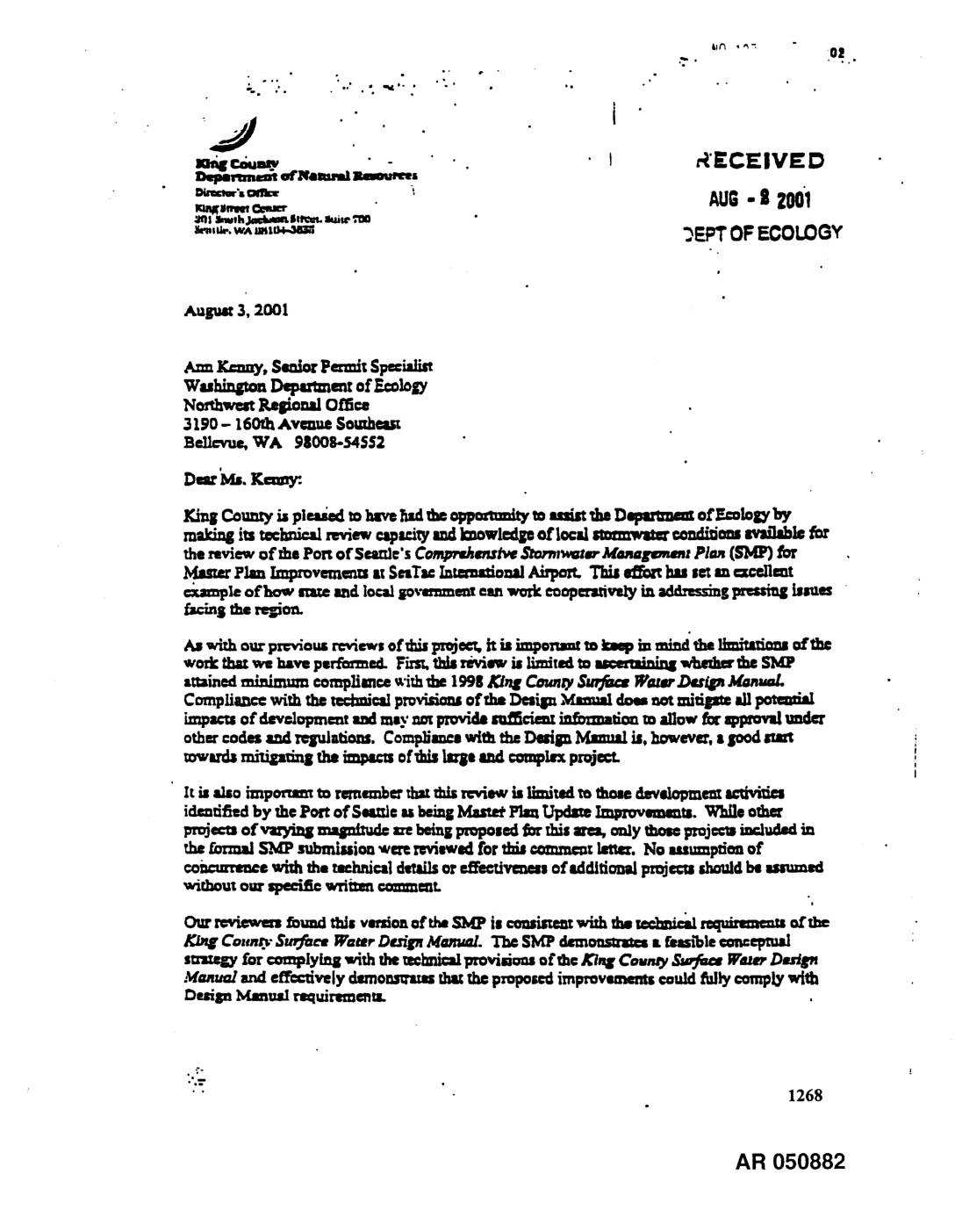 _le of how susieandlocal_va_mes_ ,-anwork_oper_w.ty in add.-essing_ b_es fi_--in$theregion. As with our prcv/ousrcview, old,is pmjec_ h is imponsutto k.ep in mindthe_ ofthc workth_ v_ have peril:st'reed.First,thisrivimv is li_tied to Mcemtinil_ whedm'theSMP attainedminimumcompliancewi:hdse1998/f/nZ CountySuvfacz Wa_m.Dzr_ M_u/. Compliancewiththe tectmictlprovisionsof theIksil_ .Mmmaldoranot mitilp_ all pomni_ impac_ ot'devclopmasttad m_' nm pmvi&,su_ciesu ;,,¢-,_.,,_ m allow forspprovalunder othercodes &ud_-gulations.ComplismcewiththeDesignlVr_as_is. however,a Soodsu_ m'vtrd__ the impactsofdds Iml. andcomplexpmjecL ! It is alsoimpo_um'_m rm'n_ _ this_ew is l_miu_lm _ d,mv_d(_m_ identifiedby thePortof Smt_lcasbeingMasted'PlanUpdateImprovemmtLWhileother projecuofvvyi_ masn/n_ are_ proposedfor_s ares,onlythmcpmjcmincludsdin rormslS!_ submmio_wererevi.w.dfor,u. ce_uncu_lt_z. Nomu=pdeaof _z_'eu_e wishthe tochn/celdmils or r.ffi_-dvmessoftddidonal pmjem tSauld be m'um_ w'ir.homo,r specific writnmcmnmm_. Ourmviewemfoundthisvendonoftht SMPiscousimm_wkh thB__ of the Co.nl3,."Surfa_ WaterD_.6gnMamml. The SMPdt_nonslrxI_• fe_'ble cencepmxl s_ for complyin8withthe_chrlicalprovisionsof'_hcA'3a_Co,,my..quv___..eWmerDmign :Wanua/andeffectively dsmonscms thttthcproposcdimproveawmscouldfullycomplywith Duisn Manualr_t,;reme_ .'-.. ' " " 1268 AR 050882 • o,. o _" . o ".. o . _ o , •° • . _ • e '* o "-o _3, 2001 P,nclosureIprovidespncnd couunmma7eaho_"theSMPnaiads mthespecificcornsad specialrequkzmannof the£_lrCm,ely,_'fac,tram,_ Ma_m/.aswellasn ovuview of_hemvicw scope andlimiutmms. Enclosure2 providest sununav/of thevarioussur_= w_ facilitiespmpos_ forco=ms=ion. alongwithspecific informazionon _ hcili_, suchu b volume ofthe facile', _hedrainage aresroyal, andtheamountof janus aresu-,'_umTto each facility. •Thankyou forthis opportunityto worktOlJe_h_onbehaEof thenqlion. If_u hm'eany • qumio_ pleasecomactDavidMmat, SeniorPolicyAnalyst,or Kelly _ Senior _, _ wilh the W_ _,_dla_ l_um_.u Divide. D_hl ambo _ z (206)296-1982 or via e-mail al _davld__/_.vnee, ake._ov. Kzl]y C_ be rmtchedE (206)2964327 or via e-mailazk_elly-whk_e_amlcc._v. " Sk=ac_y. Pare Bissonn-_ne_ Director ¢¢: The HonorableRon Sims, KiagCounty.f.xecutivc 1_y He._l[. Norvhwect_ Dire_. Wathkqlton l_spsruneatof EcoloiD' PaulTanaka.CountyAdmi_ Offic=. Deperunauof CountyActminismuion Tim Ceis, Chicf ofSta_ _ CountyExecmivoO_ce KurtTrlpleu.Depuly Director,KlnlgCourtlyDcp_ ofNatuml Rzsources(Dlql_) Nancy_… -