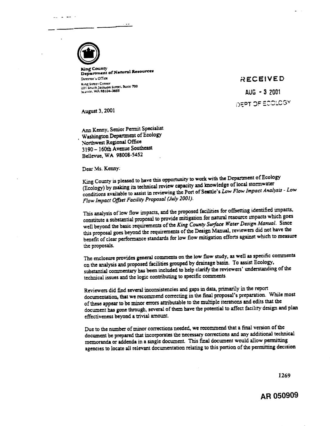 August 3, 2001 i3E=T 3F ECC, LC,.Gv Ann Kenny, Senior Pm'mJt Specialist , Washington Dcpanm=nt of Ecology Northwest Regional Office 3190 - 160th Avmu¢ $outhcasl Bellevue, WA 9800g-$452 Dear Ms. Kenny; King County is pleased to have this opporttmiW to work with the Department of Ecology (Ecology) by making its technical review capacity and knowledge of local =ormwater conditions available to assistin reviewing the Port of S=_e's Low Flow Impact Analy$ia - Low Flow Impact Offset Facilily Proposal (July 2001). This analysis of low flow impacts, and the propos=d facilities for offsetting identified Isnpacts, constimto a substantial proposal to provide mitigation for natural resource m_pscts which goes well beyond the basic requirements of the King County Surface Water Design Manual. Since this proposal goes beyond the requirements of the Design Manual, reviewers did not have the be=¢fit of clem"per/orJ_anc¢standards/or low flow mitigation efforts against which to measure the proposals. The enclosure provide= gcmer41comments on the low flow study, as well as specific comments on the analysis and proposed facilities grouped by drainage basin. To assist Ecology, substantial commentary hm bcen included to hclp clarify the reviewm-s' undersmading of the tccZuzicalissues and the logic contributing to specific comments, Reviewers did find several inconsistencies and gaps m data, primarily in the report documentation, that we reconmaend correcting in the final proposal's preparation. While most of these appear to be minor errors attributable to the mul_ple itcratsons and edits that the documenthasgonethrough, several of them have thc potential toaffect facilitydesign andplan effectiveness beyond… -