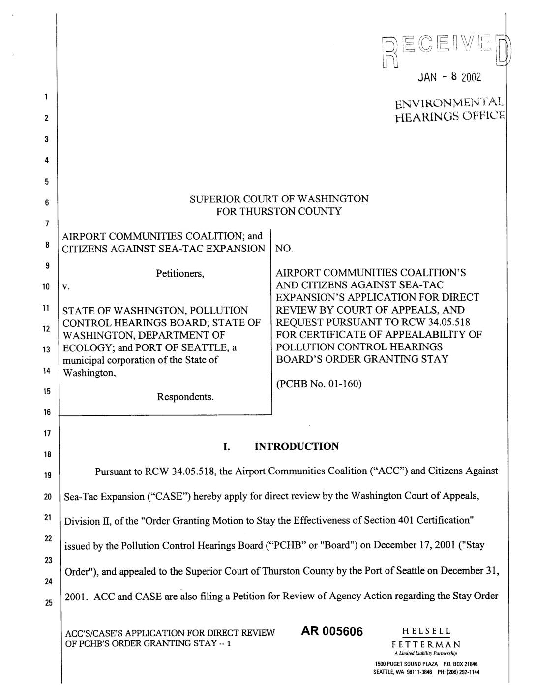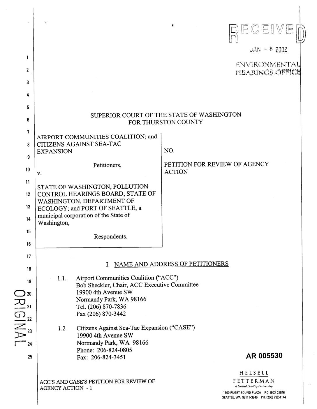_>23 1.2 Citizens Against Sea-Tac Expansion ("CASE")19900 4th Avenue SW i"'- 24 Normandy Park, WA 98166 Phone: 206-824-0805 Fax: 206-824-3451 AR 005530 HELSELL ACC'S AND CASE'S PETITION FOR REVIEW OF F E T T E ILM A N AGENCY ACTION - 1 a Limited Liability Pa..... hip 1500 PUGETSOUND PLAZA EO. BOX21846 SEATrLE,WA98111-3846PH:(206)292-1144 II. NAME AND ADDRESS OF PETITIONERS' ATTORNEYS 2.1. Attorneys for Airport Communities Coalition ("ACC") Peter J. Eglick, WSBA No. 8809 Kevin L. Stock, WSBA No. 14541 Michael P. Witek, WSBA No. 26598 HELSELL FETTERMAN LLP 1325 Fourth Avenue, Suite 1500 P.O. Box 21846 Seattle, WA 98111 Tel. (206) 292-1144 Fax (206) 340-0902 Rachael Paschal Osbom, WSBA No. 21618 Attorney at Law 2421 West Mission Avenue Spokane, WA 99201 Tel. (509) 328-1087 Fax (509) 328-8144 2.2 Attorneys for Citizens Against Sea-Tac Expansion ("CASE"): Richard A. Poulin, WSBA No. 27782 Of Counsel Smith & Lowney P.L.L.C. 2317 East John Street Seattle, WA 98112 is Tel. (206) 860-1394 Fax (206) 860-418719 III. NAME AND ADDRESS OF AGENCY WHOSE ACTION IS AT ISSUE ACC and CASE seek judicial review of a decision by the Pollution Control Hearings Board ("PCHB"), whose mailing address is: AR 005531 HELSELL ACC'S AND CASE'S PETITION FOR REVIEW OF F ET T E R M A N AGENCY ACTION - 2 ALimitedLiability P...... hip 1500PUGETSOUNDPLAZA P.O.BOX21846 SEAI-I'LE,WA 98111-3846 PH:(206)292-1144 Office of Environmental Hearings 4224 6thAvenue S.E. Bldg 2, Rowe 6 P.O. Box 40903 Olympia, WA 98504-0903. IV. AGENCY ACTIONS AT ISSUE 4.1 ACC and CASE ("Petitioners") seek…