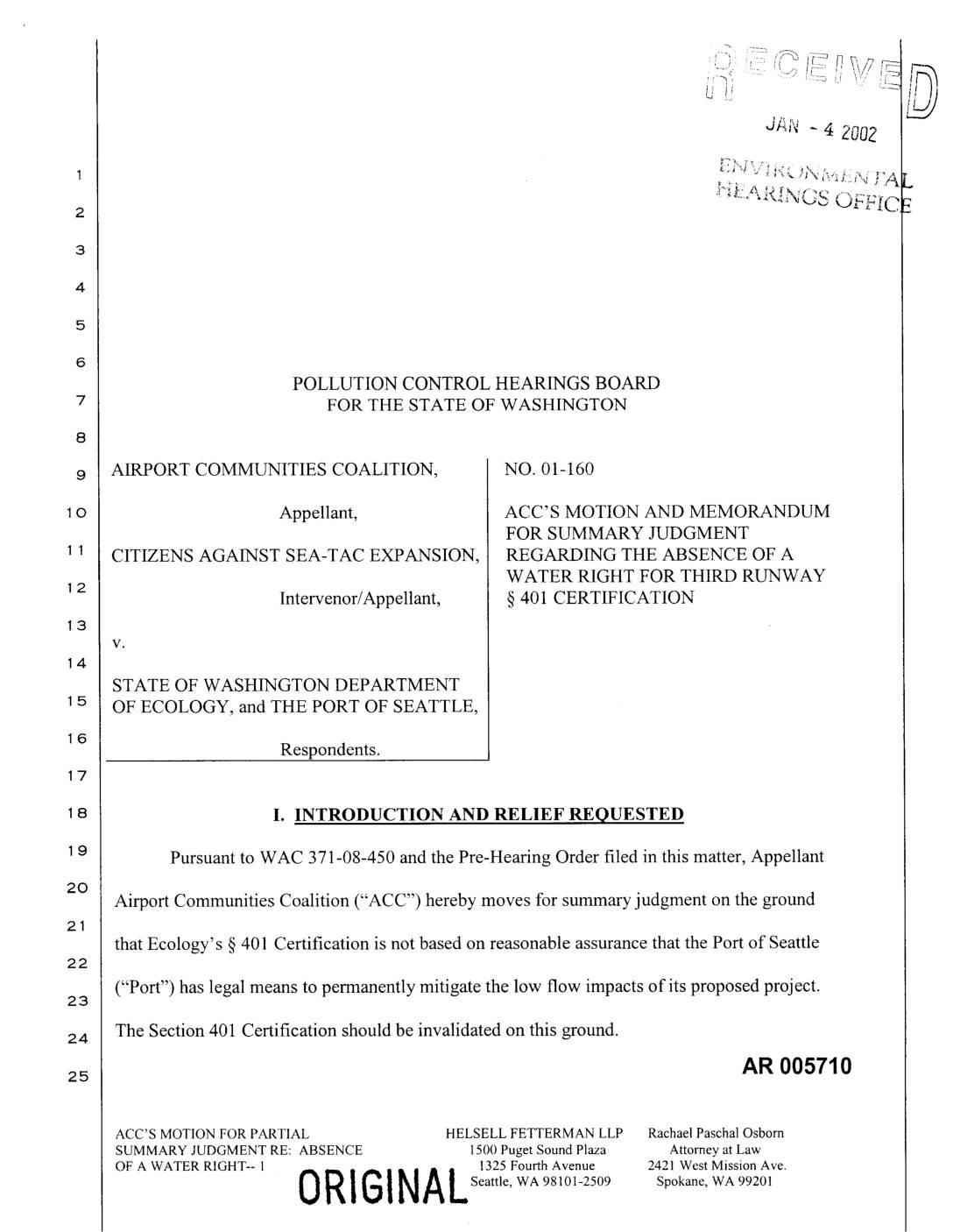 OF ECOLOGY, and THE PORT OF SEATTLE, Respondents. I. INTRODUCTION AND RELIEF REQUESTED Pursuant to WAC 371-08-450 and the Pre-Hearing Order filed in this matter, Appellant Airport Communities Coalition ("ACC") hereby moves for summary judgment on the ground that Ecology' s § 401 Certification is not based on reasonable assurance that the Port of Seattle ("Port") has legal means to permanently mitigate the low flow impacts of its proposed project. The Section 401 Certification should be invalidated on this ground. AR 005710 ACC'S MOTION FOR PARTIAL HELSELL FETTERMAN LLP Rachael Paschal Osborn SUMMARY JUDGMENT RE: ABSENCE 1500 Puget Sound Plaza Attorney at Law OF A WATER RIGHT-- 1 1325 Fourth Avenue 2421 West Mission Ave. R 1 6 1N A Lseattle, WA 98101-2509 Spokane, WA 99201 II. STATEMENT OF FACTS On September 21, 2001, the Department of Ecology issued a revised Section 401 Certification to the Port of Seattle for the Port's Master Plan Update of Sea-Tac International Airport (commonly referred to as the "Third Runway Project"). The Section 401 Certification contains "Conditions for Mitigation of Low Flow Impacts," approving the Port's low flow mitigation plan. 401 Cert. at p. 22. The low flow plan contemplates the capture and use of stormwater to offset the impacts of construction of the Third Runway Project on three local streams: Des Moines, Miller and Walker Creeks. 1o On December 17, 2001, the Board issued its Order Granting Motion to Stay the Effectiveness of Section 401 Certification. Among other rulings, the Board found that… -