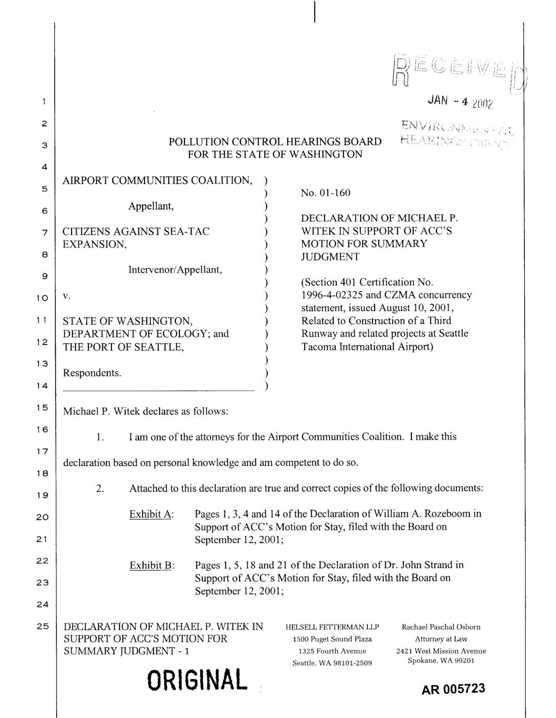 1o v. ) 1996-4-02325 and CZMA concurrency ) statement, issued August 10, 2001, STATE OF WASHINGTON, ) Related to Construction of a Third DEPARTMENT OF ECOLOGY; and ) Runway and related projects at Seattle THE PORT OF SEATTLE, ) Tacoma International Airport) ) Respondents. ) ) Michael P. Witek declares as follows: 1. I am one of the attorneys for the Airport Communities Coalition. I make this declaration based on personal knowledge and am competent to do so. 2. Attached to this declaration are true and correct copies of the following documents:19 2o Exhibit A: Pages 1, 3, 4 and 14 of the Declaration of William A. Rozeboom in Support of ACC's Motion for Stay, filed with the Board on September 12, 2001; Exhibit B: Pages 1, 5, 18 and 21 of the Declaration of Dr. John Strand in Support of ACC's Motion for Stay, filed with the Board on September 12, 2001; DECLARATION OF MICHAEL P. WITEK IN HELSELLFETTERMANLLP Rachael Paschal Osborn SUPPORT OF ACC'S MOTION FOR 1500PugetSound Plaza Attorneyat Law SUMMARY JUDGMENT - 1 1325 Fourth Avenue 2421 West Mission Avenue Seattle, WA 98101-2509 Spokane, WA 99201 ORIGINAL Exhibit C: Pages 1, 4, 5 and 20 of the Declaration of Dr. Peter Willing in Support of ACC's Motion for Stay, filed with the Board on September 12, 2001. declare under penalty of perjury under the laws of the State of Washington that the isco ect.6 DATED this 4th day of January, 2002, at Seattle, Was i . p7… -