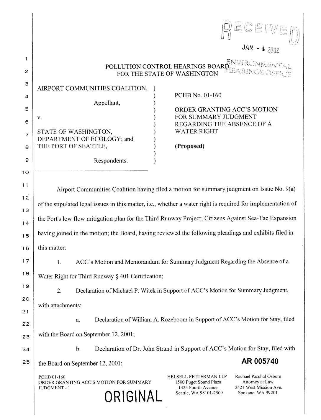 Airport Communities Coalition having filed a motion for summary judgment on Issue No. 9(a) of the stipulated legal issues in this matter, i.e., whether a water right is required for implementation of the Port's low flow mitigation plan for the Third Runway Project; Citizens Against Sea-Tac Expansion having joined in the motion; the Board, having reviewed the following pleadings and exhibits filed in this matter: 1. ACC's Motion and Memorandum for Summary Judgment Regarding the Absence of a Water Right for Third Runway § 401 Certification; 2. Declaration of Michael P. Witek in Support of ACC's Motion for Summary Judgment, with attachments: a. Declaration of William A. Rozeboom in Support of ACC's Motion for Stay, filed with the Board on September 12, 2001; 2_4 b. Declaration of Dr. John Strand in Support of ACC's Motion for Stay, filed with the Board on September 12, 2001; AR 005740 -