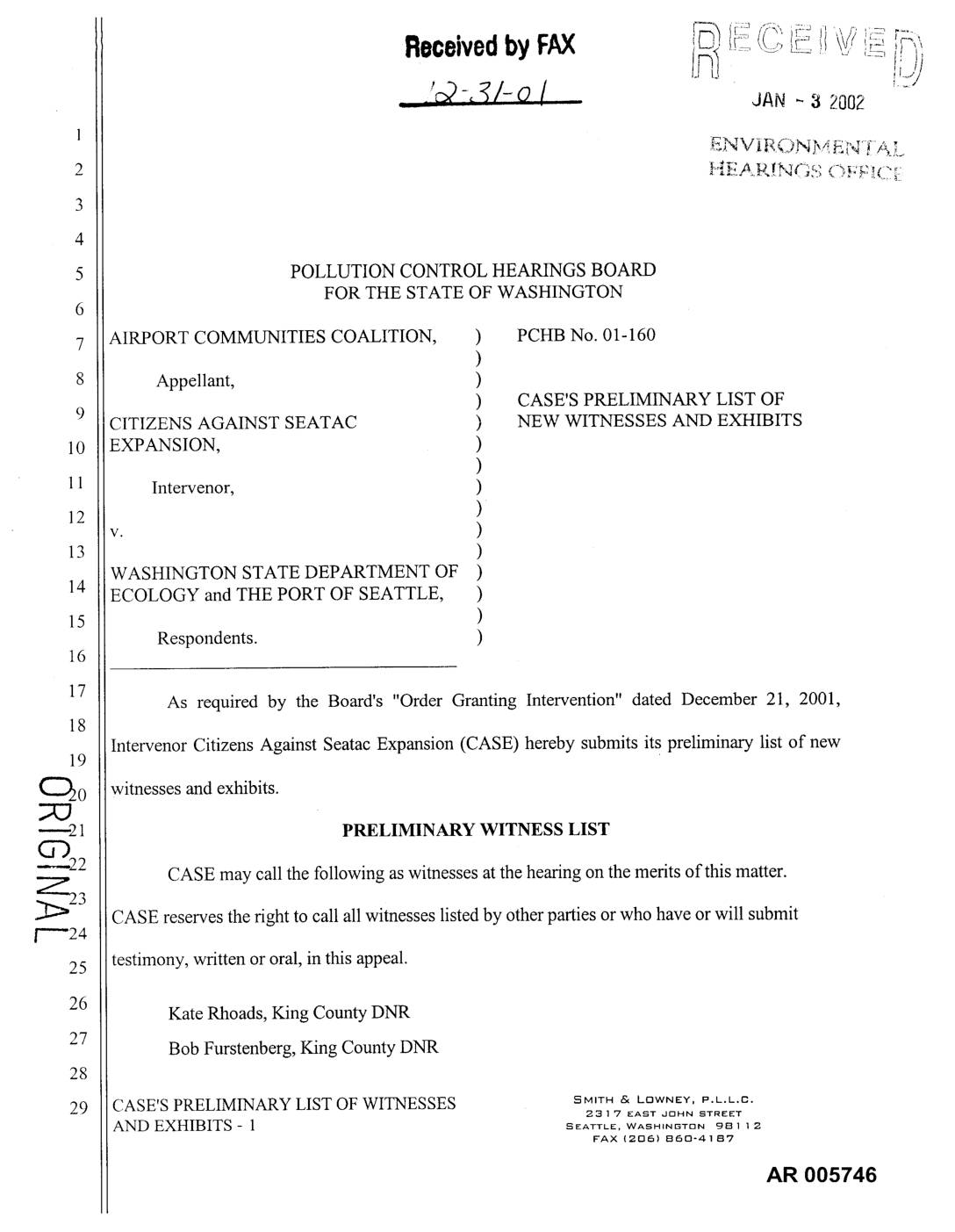 ECOLOGY and THE PORT OF SEATTLE, ) ) Respondents. ) As required by the Board's "Order Granting Intervention" dated December 21, 2001, Intervenor Citizens Against Seatac Expansion (CASE) hereby submits its preliminary list of new C_20 witnesses and exhibits. ;XJ PRELIMINARY WITNESS LIST CASE may call the following as witnesses at the hearing on the merits of this matter. _23 CASE reserves the right to call all witnesses listed by other parties or who have or will submit /---24 testimony, written or oral, in this appeal. Kate Rhoads, King County DNR Bob Furstenberg, King County DNR CASE'S PRELIMINARY LIST OF WITNESSES SMITH_ LOWNEY, P.L.L.C._-3 1 7 EAST JOHN STREET AND EXHIBITS - 1 S_L_, W_H,_O. 9811 z VAX i2oal B_O-41B7 AR 005746 PRELIMINARY EXHIBIT LIST CASE incorporates by reference and may introduce any or all documents listed by any of4 the parties on their exhibit lists submitted to date. In addition, CASE identifies the following exhibits. 1. Documents relating to construction stormwater monitoring produced by the Port of Seattle in 2001 in response to a Public Disclosure Act request from Greg Wingard.9 2. National Pollutant Discharge Elimination System Waste Discharge Permit No. WA- 002465-1, Modification Date May 29, 2001 (NPDES Permit as modified, and Fact Sheet with Addenda). 3. Discharge Monitoring Reports generated by the Port of Seattle and submitted to the Department of Ecology under NPDES Permit No. WA-002465-1. DATED this 31st day of December, 2001. SMITH & LFIWNEY, P,L.L.C. By: Richard A. Poulin, Of Counsel WSBA # 27782… -